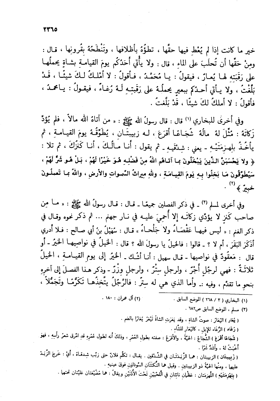 وفي أخرى للبخاري (1) قال: قال رسول الله صلى الله عليه وسلم: "من آتاه الله مالاً، فلم يؤد زكاته: مثل له ماله شجاعاً أقرع، له زبيبتان، يطوقه يوم القيامة، ثم يأخذ بلهزمتيه- يعني: شدقيه- ثم يقول: أنا مالك، أنا كنزك، ثم تلا: {وَلَا يَحْسَبَنَّ الَّذِينَ يَبْخَلُونَ بِمَا آتَاهُمُ اللَّهُ مِنْ فَضْلِهِ هُوَ خَيْرًا لَهُمْ، بَلْ هُوَ شَرٌّ لَهُمْ، سَيُطَوَّقُونَ مَا بَخِلُوا بِهِ يَوْمَ الْقِيَامَةِ، وَلِلَّهِ مِيرَاثُ السَّمَاوَاتِ وَالْأَرْضِ، وَاللَّهُ بِمَا تَعْمَلُونَ خَبِيرٌ} (2).