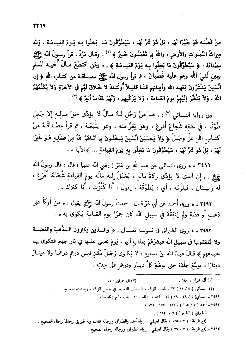 3491 - * روى النسائي عن عبد الله بن عمر (رضي الله عنهما) قال: قال رسول الله صلى الله عليه وسلم: "إن الذي لا يؤدي زكاة ماله، يخيل إليه ماله يوم القيامة شجاعاً أقرع، له زبيبتان، فيلزمه، أي: يطوقه، يقول: أنا كنزك، أنا كنزك".