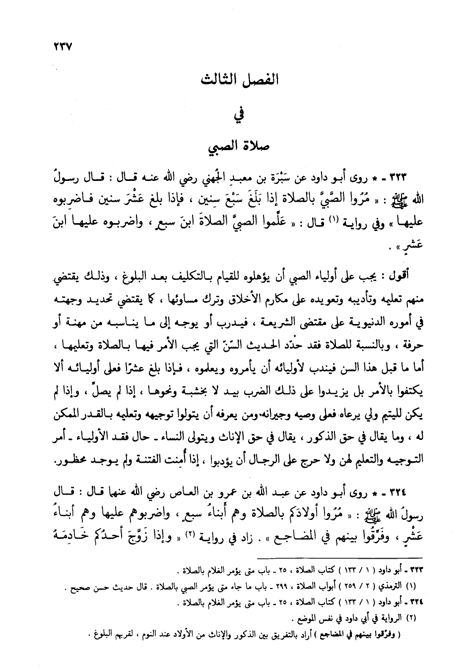 323 - * روى أبو داود عن سبْرَة بن معبد الجُهني رضي الله عنه قال: قال رسول الله صلى الله عليه وسلم: "مُرُوا الصبيَّ بالصلاة إذا بلغ سبع سنين، فإذا بلغ عشر سنين فاضربوه عليها" وفي رواية (1) قال: "علموا الصبيَّ الصلاة ابن سبعٍ، واضربوه عليها ابن عشرٍ".