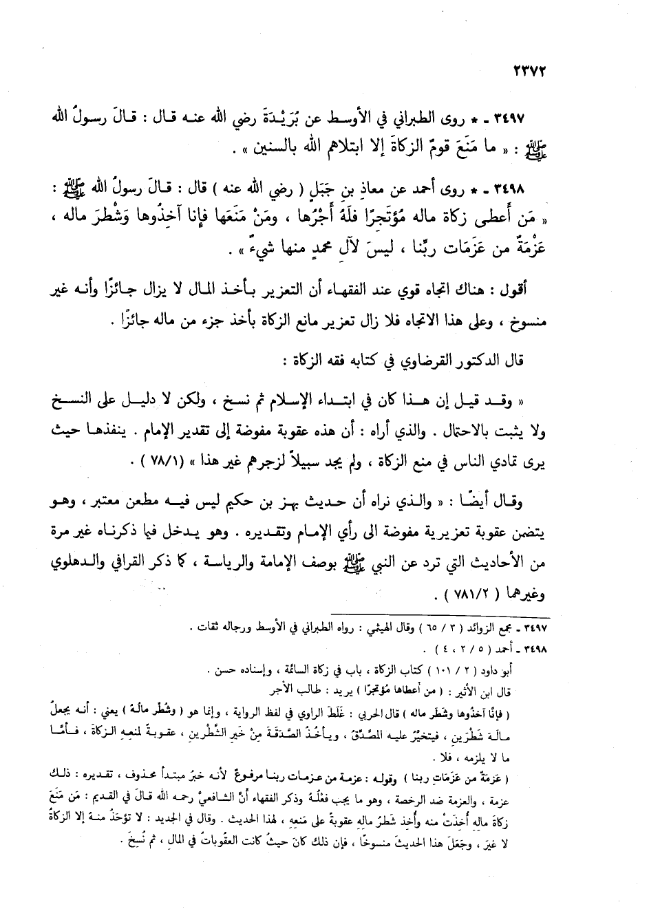 3498 - * روى أحمد عن معاذ بن جبل (رضي الله عنه) قال: قال رسول الله صلى الله عليه وسلم: "من أعطى زكاة ماله مؤتجراً فله أجرها، ومن منعها فإنا آخذوها وشطر ماله، عزمة من عزمات ربنا، ليس لآل محمد منها شيء".