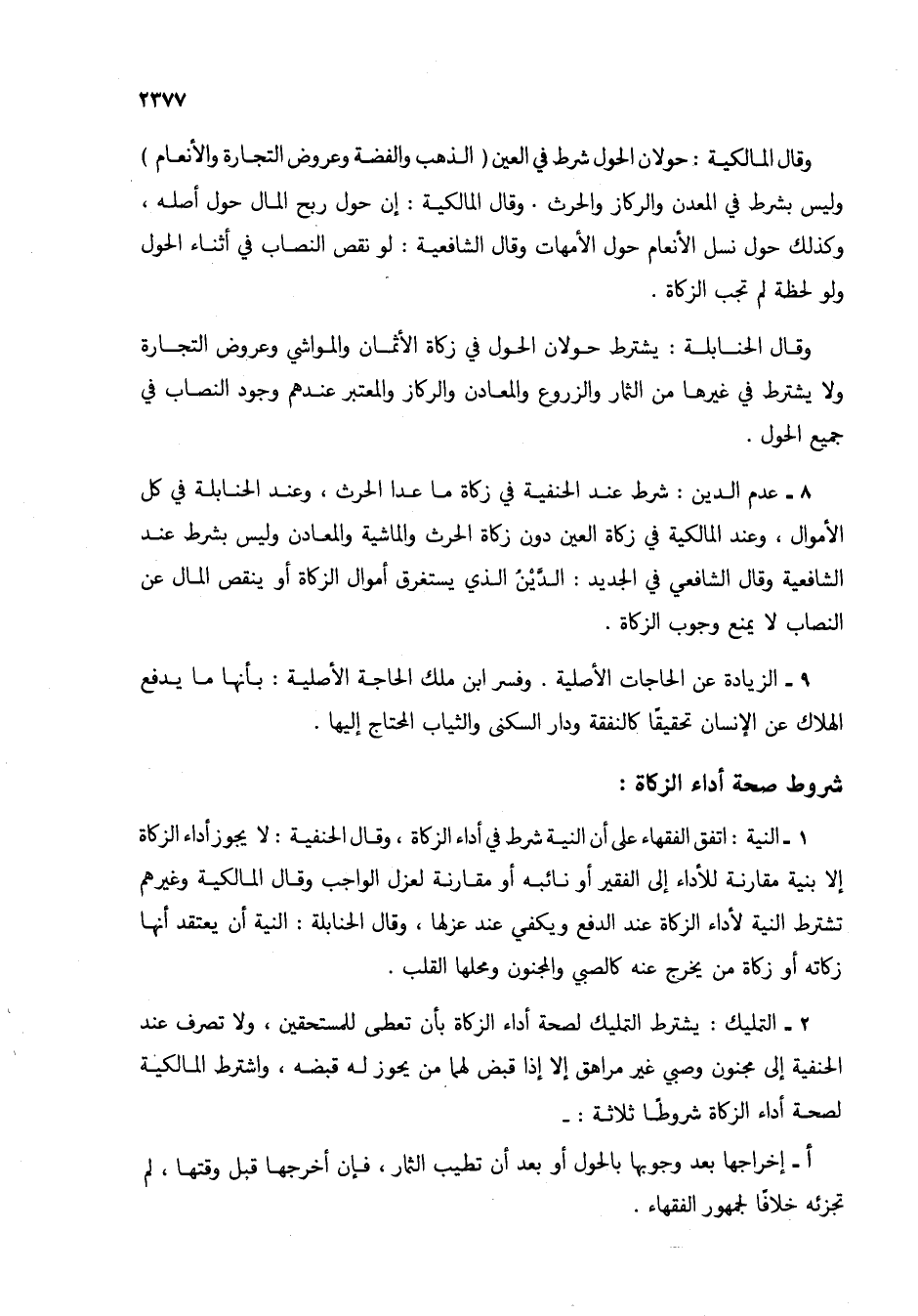 8 - عدم الدين: شرط عند الحنفية في زكاة ما عدا الحرث، وعند الحنابلة في كل الأموال، وعند المالكية في زكاة العين دون زكاة الحرث والماشية والمعادن وليس بشرط عند الشافعية وقال الشافعي في الجديد: الدين الذي يستغرق أموال الزكاة أو ينقص المال عن النصاب لا يمنع وجوب الزكاة.
