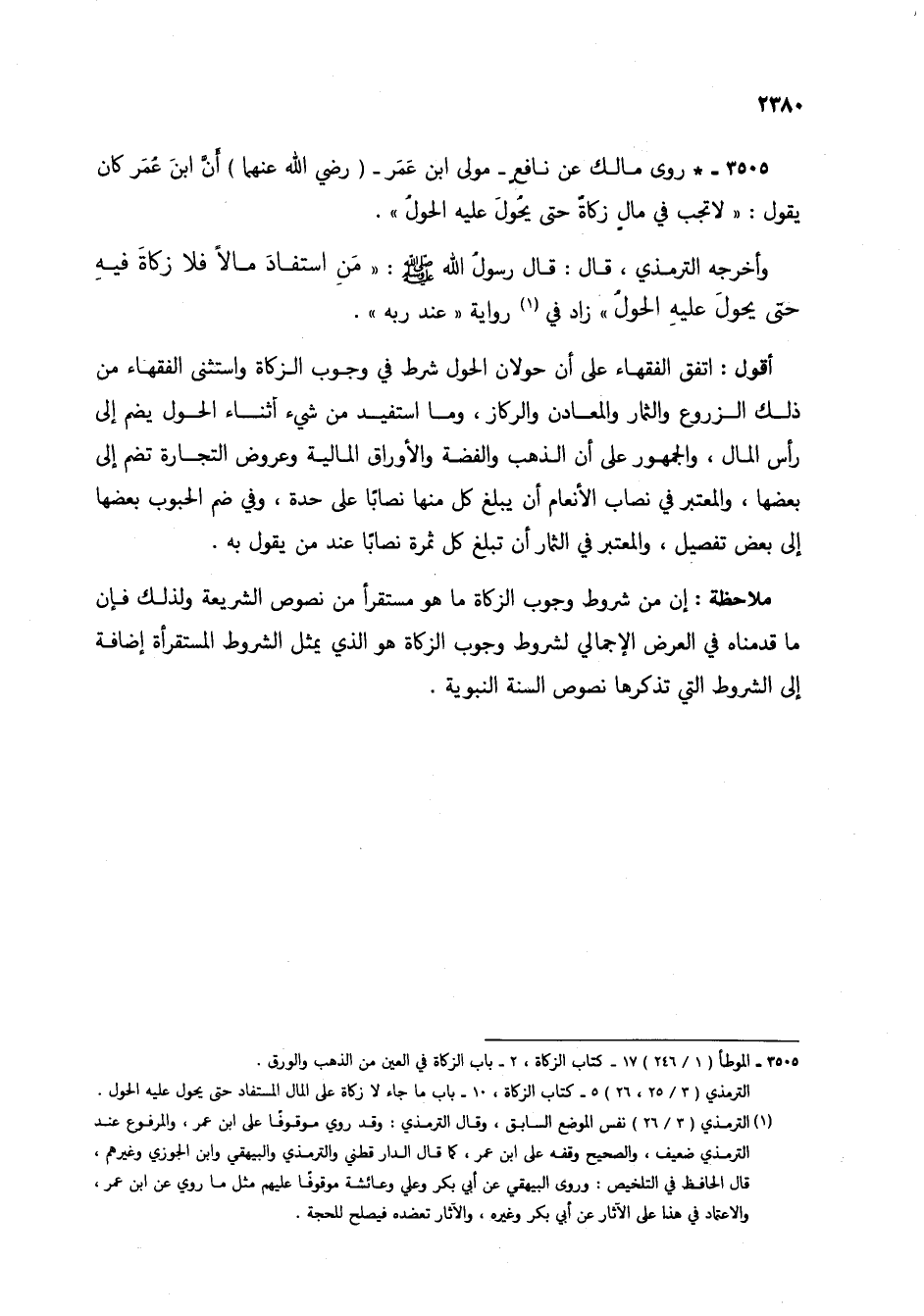 3505 - *روى مالك عن نافع- مولى ابن عمر- (رضي الله عنهما) أن ابن عمر كان يقول: "لا تجب في مال زكاة حتى يحول عليه الحول".