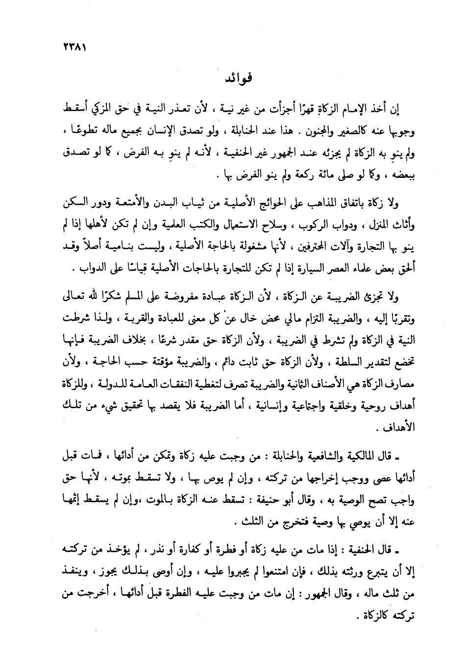 ولا زكاة باتفاق المذاهب على الحوائج الأصلية من ثياب البدن والأمتعة ودور السكن وأثاث المنزل، ودواب الركوب، وسلاح الاستعمال والكتب العلمية وإن لم تكن لأهلها إذا لم ينو بها التجارة وآلات المحترفين، لأنها مشغولة بالحاجة الأصلية، وليست بنامية أصلاً وقد ألحق بعض علماء العصر السيارة إذا لم تكن للتجارة بالحاجات الأصلية قياساً على الدواب.