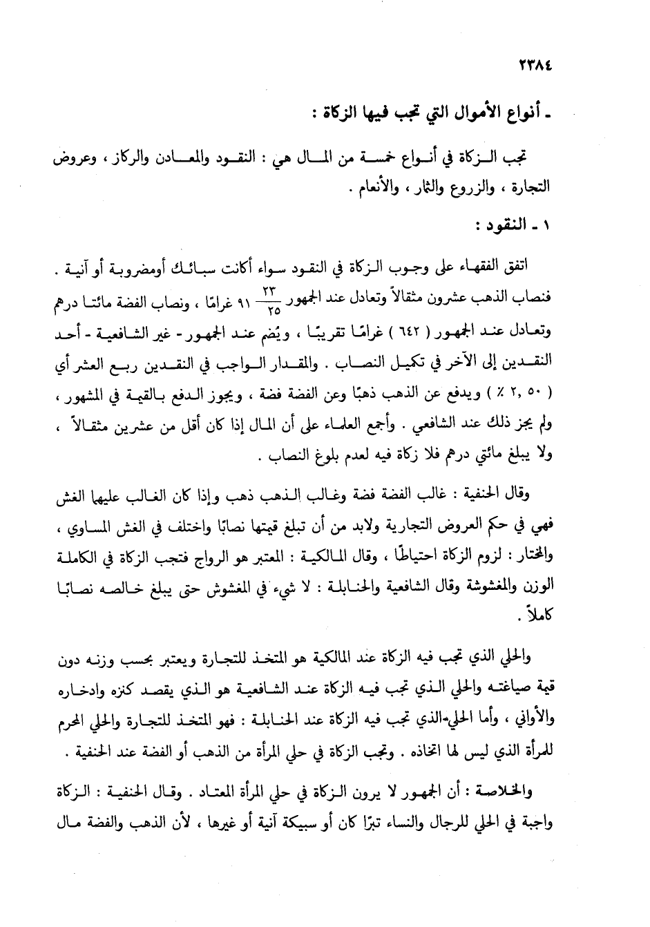 عشرون مثقالاً وتعادل عند الجمهور 23/ 25 91 غراماً، ونصاب الفضة مائتا درهم وتعادل عند الجمهور (642) غراماً تقريباً، ويضم عند الجمهور- غير الشافعية- أحد النقدين إلى الآخر في تكميل النصاب. والمقدار الواجب في النقدين ربع العشر أي (2.50%) ويدفع عن الذهب ذهباً وعن الفضة فضة، ويجوز الدفع بالقيمة في المشهور، ولم يجز ذلك عند الشافعي. وأجمع العلماء على أن المال إذا كان أقل من عشرين مثقالاً، ولا يبلغ مائتي درهم فلا زكاة فيه لعدم بلوغ النصاب.