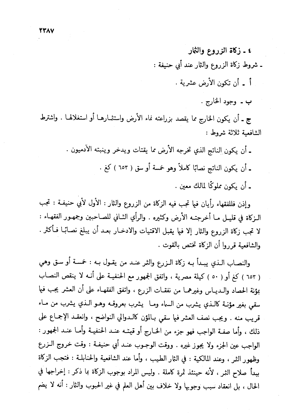 وإذن فللفقهاء رأيان فيما تجب فيه الزكاة من الزروع والثمار: الأول لأبي حنيفة: تجب الزكاة في قليل ما أخرجته الأرض وكثيره. والرأي الثاني للصاحبين وجمهور الفقهاء: لا تجب زكاة الزروع والثمار إلا فيما يقبل الاقتيات والادخار بعد أن يبلغ نصاباً فأكثر. والشافعية قرروا أن الزكاة تختص بالقوت.