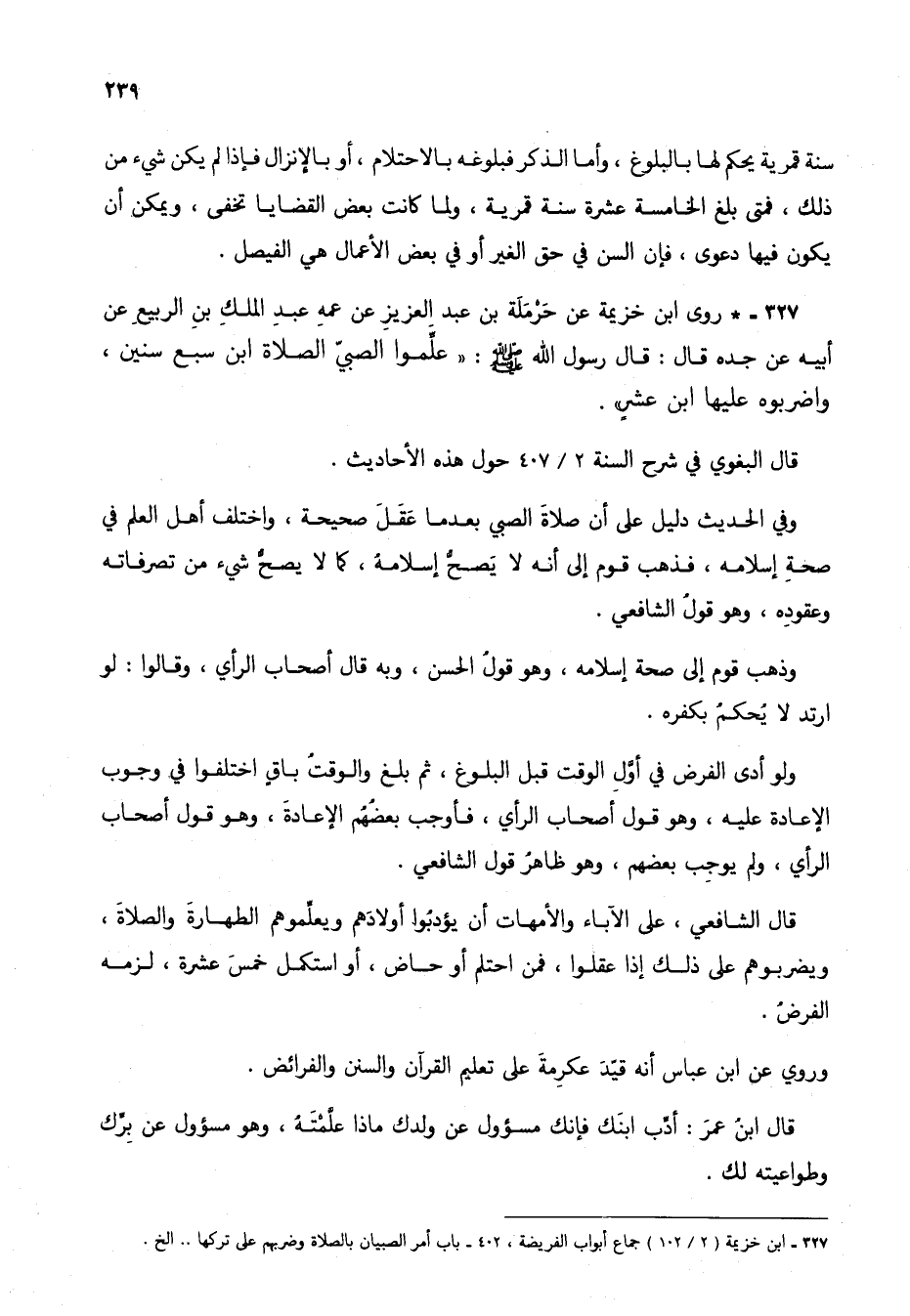 327 - * روى ابن خزيمة عن حَرْمَلة بن عبد العزيز عن عمه عبد الملك بن الربيع عن أبيه عن جده قال: قال رسول الله صلى الله عليه وسلم: "علِّموا الصبي الصلاة ابن سبع سنين، واضربوه عليها ابن عشرٍ".