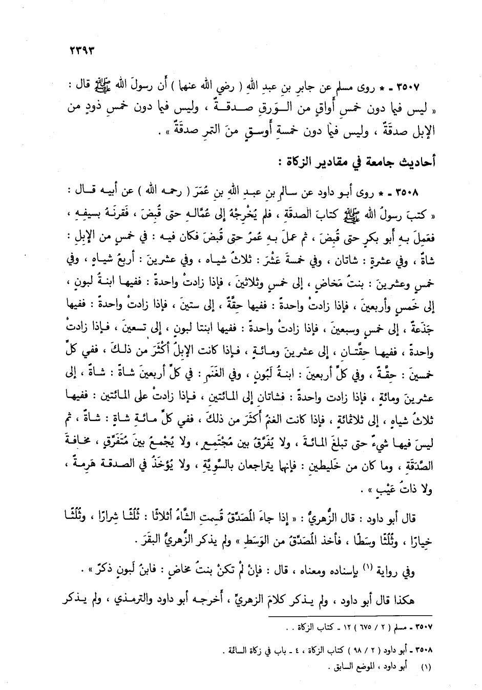 3508 - * روى أبو داود عن سالم بن عبد الله بن عمر (رحمه الله) عن أبيه قال: "كتب رسول الله صلى الله عليه وسلم كتاب الصدقة، فلم يخرجه إلى عماله حتى قبض، فقرنه بسيفه، فعمل به أبو بكر حتى قبض، ثم عمل به عمر حتى قبض فكان فيه: في خمس من الإبل: شاة، وفي عشرة: شاتان، وفي خمسة عشر: ثلاث شياه، وفي عشرين: أربع شياه، وفي خمس وعشرين: بنت مخاض، إلى خمس وثلاثين، فإذا زادت واحدة: ففيها ابنة لبون، إلى خمس وأربعين، فإذا زادت واحدة: ففيها حقة، إلى ستين، فإذا زادت واحدة: ففيها جذعة، إلى خمس وسبعين، فإذا زادت واحدة: ففيها ابنتا لبون، إلى تسعين، فإذا زادت واحدة، ففيها حقتان، إلى عشرين ومائة، فإذا كانت الإبل أكثر من ذلك، ففي كل خمسين: حقة، وفي كل أربعين: ابنة لبون، وفي الغنم: في كل أربعين شاة: شاة، إلى عشرين ومائة، فإذا زادت واحدة: فشاتان إلى المائتين، فإذا زادت على المائتين: ففيها ثلاث شياه، إلى ثلاثمائة، فإذا كانت الغنم أكثر من ذلك، ففي كل مائة شاة: شاة، ثم ليس فيها شيء حتى تبلغ المائة، ولا يفرق بين مجتمع، ولا يجتمع بين متفرق، مخافة الصدقة، وما كان من خليطين: فإنهما يتراجعان بالسوية، ولا يؤخذ في الصدقة هرمة، ولا ذات عيب".