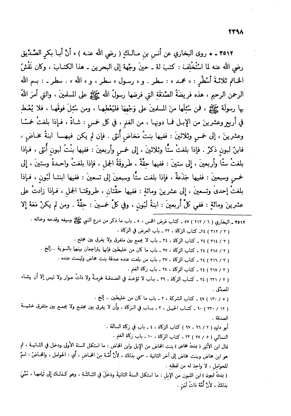 3512 - * روى البخاري عن أنس بن مالك (رضي الله عنه) "أن أبا بكر الصديق رضي الله عنه لما استخلف: كتب له- حين وجهه إلى البحرين- هذا الكتاب، وكان نقش الخاتم ثلاثة أسطر: "محمد": سطر. و"رسول" سطر، و"الله". سطر-: بسم الله الرحمن الرحيم، هذه فريضة الصدقة التي فرضها رسول الله صلى الله عليه وسلم على المسلمين، والتي أمر الله بها رسوله صلى الله عليه وسلم، فمن سئلها من المسلمين على وجهها فليعطها، ومن سئل فوقها، فلا يعط في أربع وعشرين من الإبل فما دونها، من الغنم، في كل خمس: شاة، فإذا بلغت خمساً وعشرين، إلى خمس وثلاثين: ففيها بنت مخاض أنثى. فإن لم يكن فيها ابنة مخاض، فابن لبون ذكر. فإذا بلغت ستاً وثلاثين، إلى خمس وأربعين: ففيها بنت لبون أنثى، فإذا بلغت ستاً وأربعين، إلى ستين: ففيها حقة، طروقة الجمل، فإذا بلغت واحدة وستين، إلى خمس وسبعين: ففيها جذعة، فإذا بلغت ستاً وسبعين إلى تسعين: ففيها ابنتا لبون، فإذا بلغت إحدى وتسعين، إلى عشرين ومائة: ففيها حقتان، طروقتا الجمل، فإذا زادت على عشرين ومائة: ففي كل أربعين: ابنة لبون، وفي كل خمسين: حقة. ومن لم يكن معه إلا
