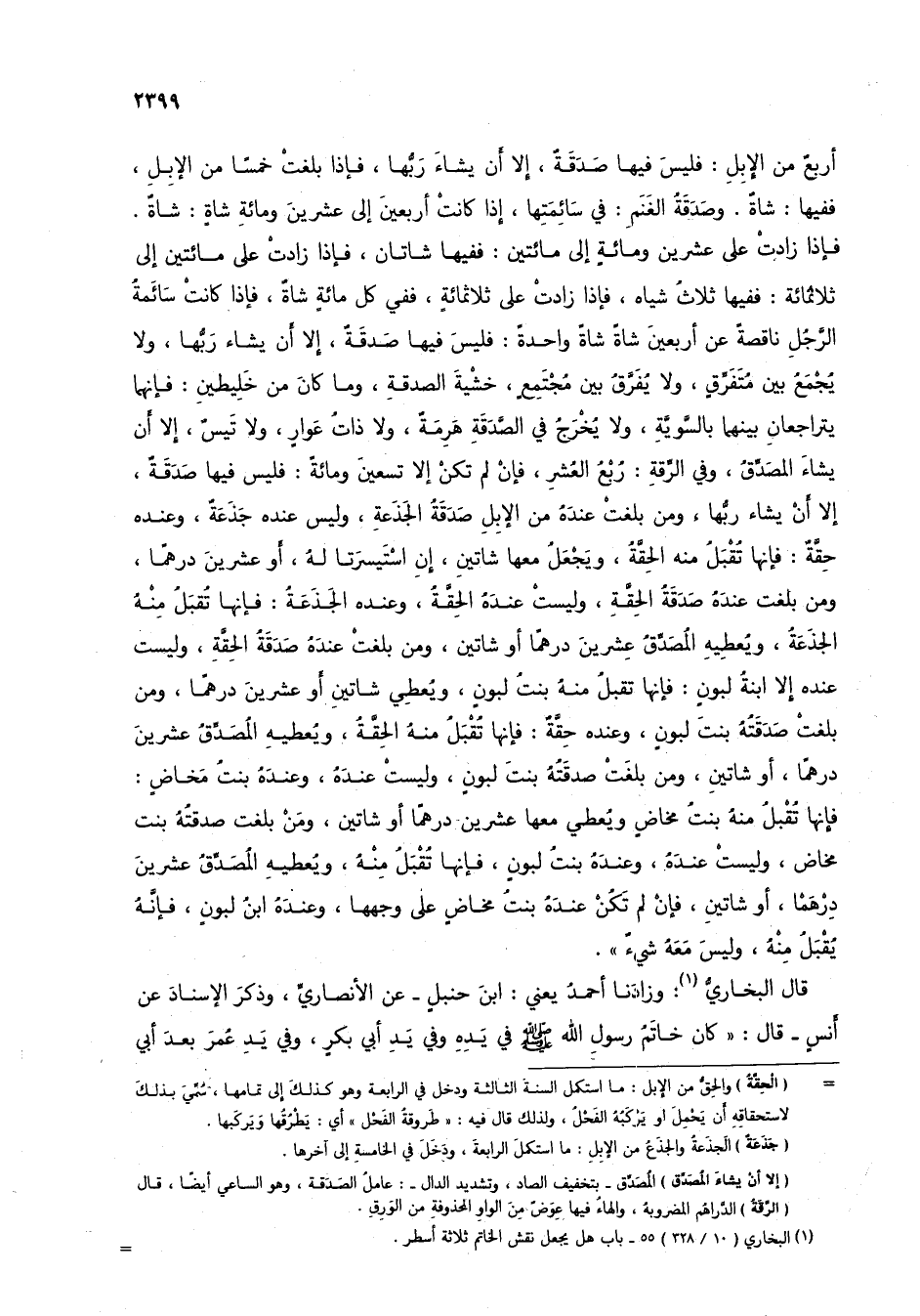أربع من الإبل: فليس فيها صدقة، إلا أن يشاء ربها، فإذا بلغت خمساً من الإبل، ففيها: شاة. وصدقة الغنم: في سائمتها، إذا كانت أربعين إلى عشرين ومائة شاة: شاة. فإذا زادت على مائتين إلى ثلاثمائة: ففيها ثلاث شياه، فإذا زادت على ثلاثمائة، ففي كل مائة شاة، فإذا كانت سائمة الرجل ناقصة عن أربعين شاة شاة واحدة: فليس فيها صدقة، إلا أن يشاء ربها، ولا يجمع بين متفرق، ولا يفرق بين مجتمع، خشية الصدقة، وما كان من خليطين: فإنهم يتراجعان بينهما بالسوية، ولا يخرج في الصدقة هرمة، ولا ذات عوار، ولا تيس، إلا أن يشاء المصدق، وفي الرقة: ربع العشر، فإن لم تكن إلا تسعين ومائة: فليس فيها صدقة، إلا أن يشاء ربها، ومن بلغت عنده من الإبل صدقة الجذعة، وليس عنده جذعة، وعنده حقة: فإنها تقبل منه الحقة، ويجعل معها شاتين، إن استيسرتا له، أو عشرين درهماً، ومن بلغت عنده صدقة الحقة، وليست عنده الحقة، وعنده الجذعة: فإنها تقبل منه الجذعة، ويعطيه المصدق عشرين درهماً أو شاتين، ومن بلغت عنده صدقة الحقة، وليست عنده إلا ابنة لبون: فإنها تقبل منه بنت لبون، ويعطي شاتين أو عشرين درهماً، ومن بلغت صدقته بنت لبون، وعنده حقة: فإنها تقبل منه الحقة، ويعطيه المصدق عشرين درهماً، أو شاتين، ومن بلغت صدقته بنت لبون، وليست عنده، وعنده بنت مخاض: فإنها تقبل منه بنت مخاض ويعطي معها عشرين درهماً أو شاتين، ومن بلغت صدقته بنت مخاض، وليست عنده، وعنده بنت لبون، فإنها تقبل منه، ويعطيه المصدق عشرين درهماً، أو شاتين، فإن لم تكن عنده بنت مخاض على وجهها، وعنده ابن لبون، فإنه يقبل منه، وليس معه شيء".