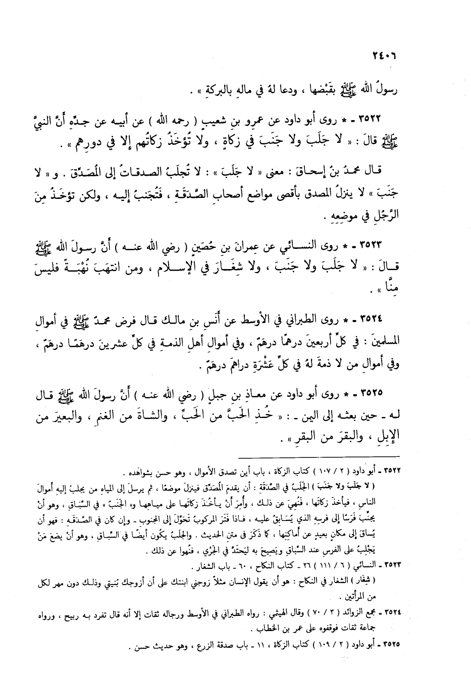 3522 - * روى أبو داود عن عمرو بن شعيب (رحمه الله) عن أبيه عن جده أن النبي صلى الله عليه وسلم قال: "لا جلب ولا جنب في زكاة، ولا تؤخذ زكاتهم إلا في دورهم".
