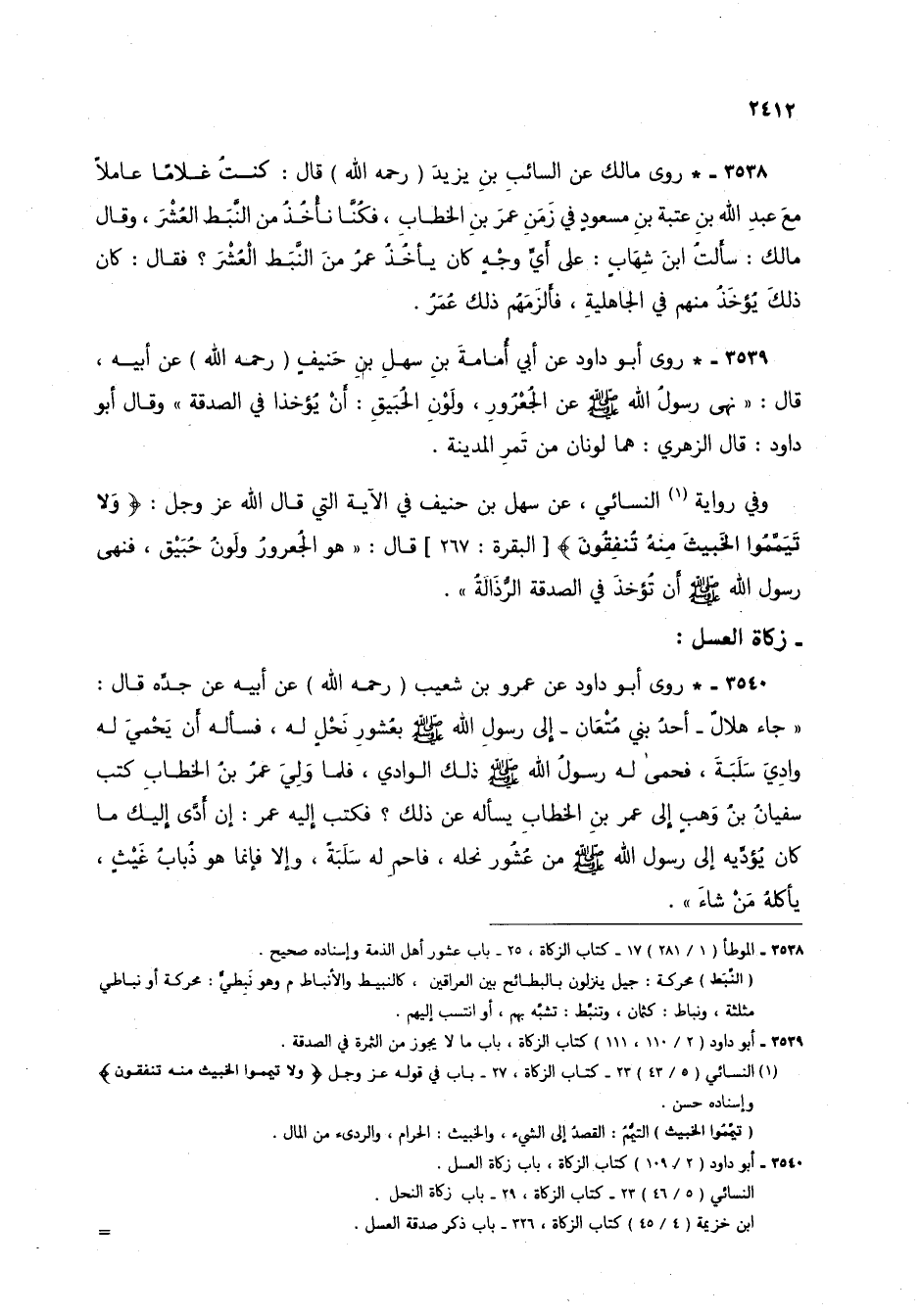 3538 - * روى مالك عن السائب عن يزيد (رحمه الله) قال: كنت غلاماً عاملاً مع عبد الله بن عتبة بن مسعود في زمن عمر بن الخطاب، فكنا نأخذ من النبط العشر، وقال مالك: سألت ابن شهاب: على أي وجه كان يأخذ عمر من النبط العشر؟ فقال: كان ذلك يؤخذ منهم في الجاهلية، فألزمهم ذلك عمر.