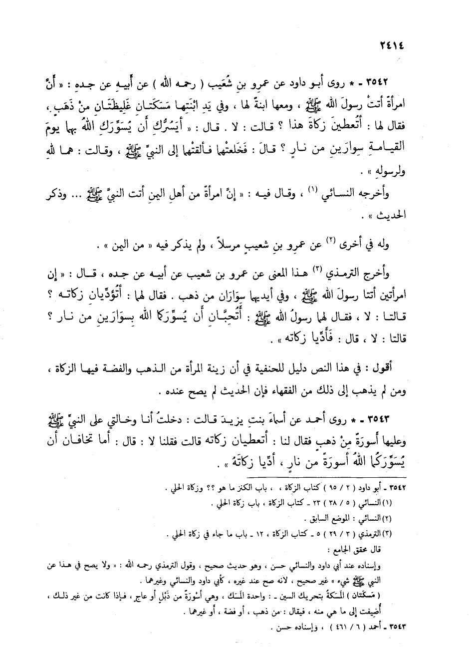 أقول: في هذا النص دليل للحنفية في أن زينة المرأة من الذهب والفضة فيها الزكاة، ومن لم يذهب إلى ذلك من الفقهاء فإن الحديث لم يصح عنده.