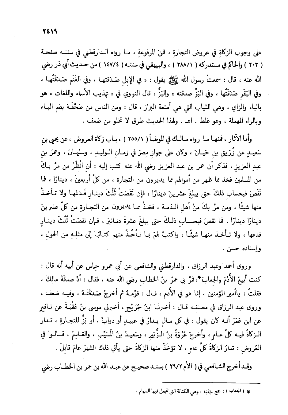 وروى أحمد وعبد الرزاق، والدارقطني والشافعي عن أبي عمرو حماس عن أبيه أنه قال: كنت أبيع الأدم والجعاب (1)، فمر بي عمر بن الخطاب رضي الله عنه، فقال: أد صدقة مالك، فقلت: يا أمير المؤمنين، إنما هو في الأدم، قال: قومه ثم أخرج صدقته، وفيه ضعف، وروى عبد الرزاق في مصنفه قال: أخبرنا ابن جريج، أخبرني موسى بن عقبة عن نافع عن ابن عمر أنه كان يقول: في كل مال يدار في عبيد أو دواب، أو بز للتجارة، تدار الزكاة فيه كل عام، وأخرج عروة بن الزبير، وسعيد بن المسيب، والقاسم، قالوا في العروض: تدار الزكاة كل عام، لا تؤخذ منها الزكاة حتى يأتي ذلك الشهر عام قابل.
