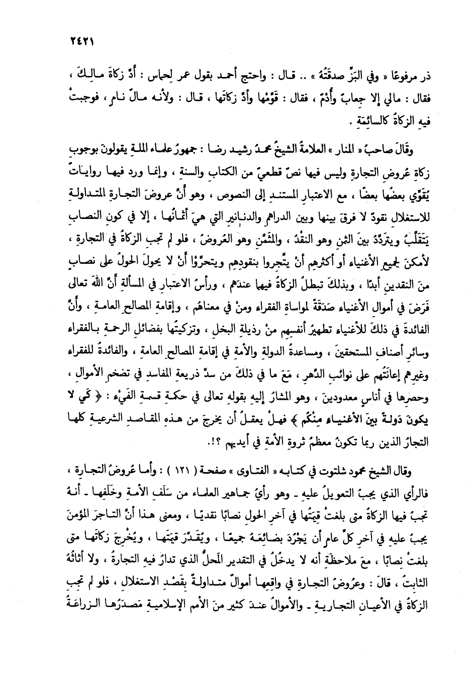 وقال صاحب "المنار" العلامة الشيخ محمد رشيد رضا: جمهور علماء الملة يقولون بوجوب زكاة عروض التجارة وليس فيها نص قطعي من الكتاب والسنة، وإنما ورد فيها روايات يقوي بعضها بعضاً، مع الاعتبار المستند إلى النصوص، وهو أن عروض التجارة المتداولة للاستغلال نقود لا فرق بينها وبين الدراهم والدنانير التي هي أثمانها، إلا في كون النصاب يتقلب ويتردد بين الثمن وهو النقد، والمثمن وهو العروض، فلو لم تجب الزكاة في التجارة، لأمكن لجميع الأغنياء أو أكثرهم أن يتجروا بنقودهم ويتحروا أن لا يحول الحول على نصاب من النقدين أبداً، وبذلك تبطل الزكاة فيهما عندهم، ورأس الاعتبار في المسألة أن الله تعالى فرض في أموال الأغنياء صدقة لمواساة الفقراء ومن في معناهم، وإقامة المصالح العامة، وأن الفائدة في ذلك للأغنياء تطهير أنفسهم من رذيلة البخل، وتزكيتها بفضائل الرحمة بالفقراء وسائر أصناف المستحقين، ومساعدة الدولة والأمة في إقامة المصالح العامة، والفائدة للفقراء وغيرهم إعانتهم على نوائب الدهر، مع ما في ذلك من سد ذريعة المفاسد في تضخم الأموال، وحصرها في أناس معدودين، وهو المشار إليه بقوله تعالى في حكمة قسمة الفيء: (كي لا يكون دولة بين الأغنياء منكم) فهل يعقل أن يخرج من هذه المقاصد الشرعية كلها التجار الذين ربما تكون معظم ثروة الأمة في أيديهم؟