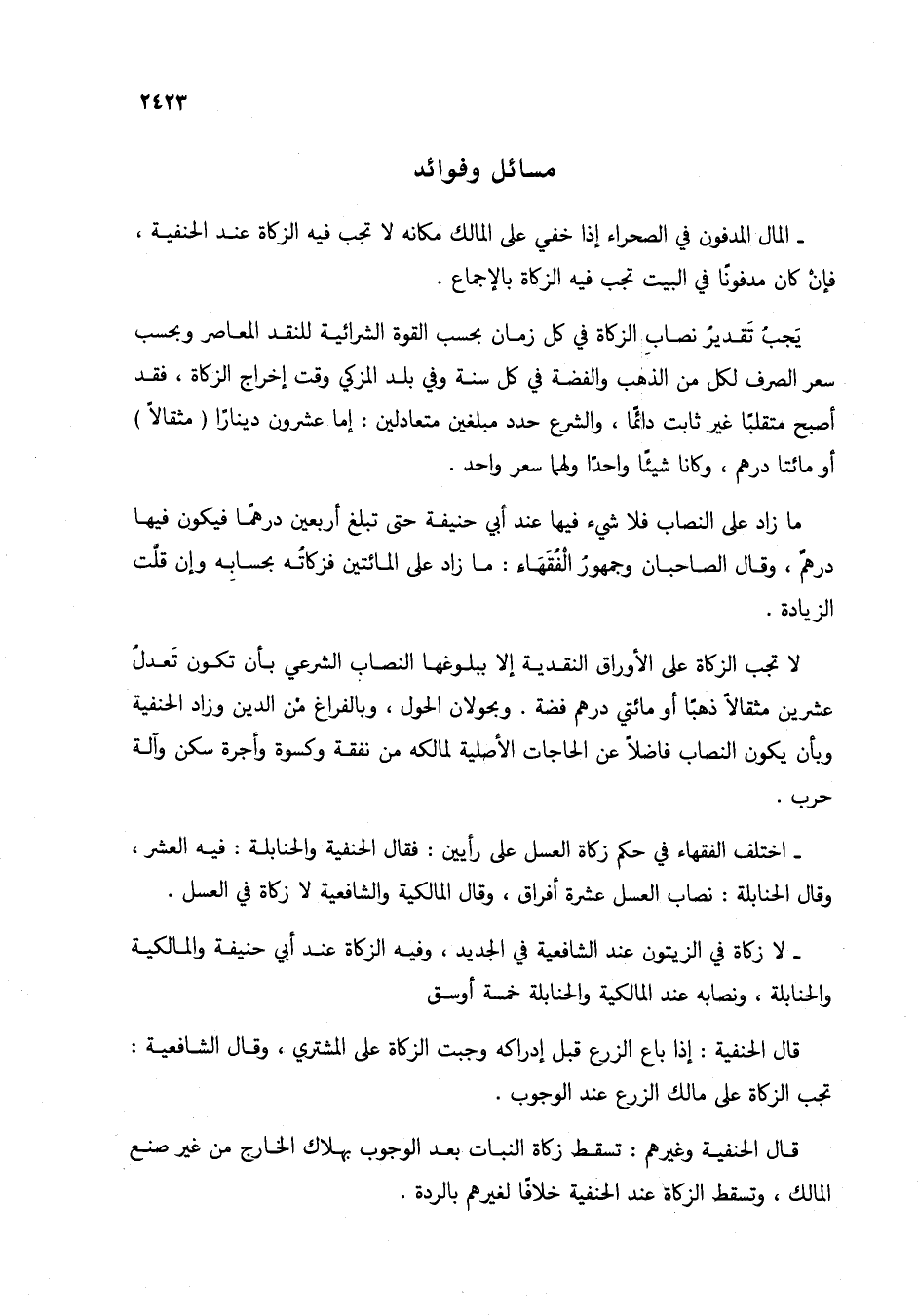 اختلف الفقهاء في حكم زكاة العسل على رأيين: فقال الحنفية والحنابلة: فيه العشر، وقال الحنابلة: نصاب العسل عشرة أفراق، وقال المالكية والشافعية لا زكاة في العسل.