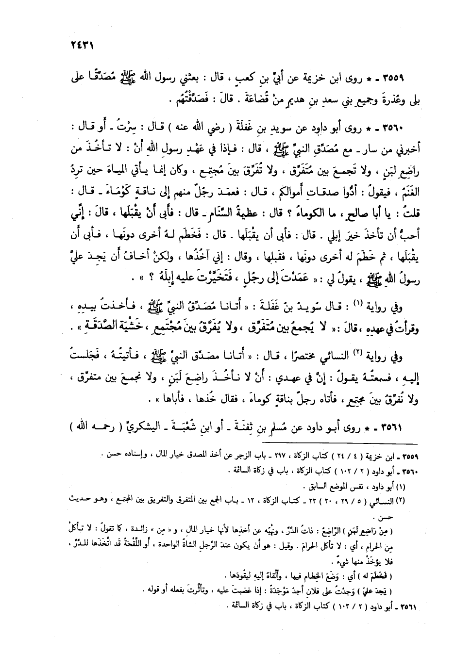 3560 - * روى أبو داود عن سويد بن غفلة (رضي الله عنه) قال: سرت- أو قال: أخبرني من سار- مع مصدق النبي صلى الله عليه وسلم، قال: فإذا في عهد رسول الله أن: لا تأخذ من راضع لبن، ولا تجمع بين متفرق، ولا تفرق بين مجتمع، وكان إنما يأتي المياه حين ترد الغنم، فيقول: أدوا صدقات أموالكم، قال: فعمد رجل منهم إلى ناقة كوماء- قال: قلت: يا أبا صالح، ما الكوماء؟ قال: عظيمة السنام- قال: فأبى أن يقبلها، قال: إني أحب أن تأخذ خير إبلي. قال: فأبى أن يقبلها. قال: فخطم له أخرى دونها، فأبى أن يقبلها، ثم خطم له أخرى دونها، فقبلها، وقال: إني آخذها، ولكن أخاف أن يجد علي رسول الله صلى الله عليه وسلم، يقول لي: "عمدت إلى رجل، فتخيرت عليه إبله؟ ".