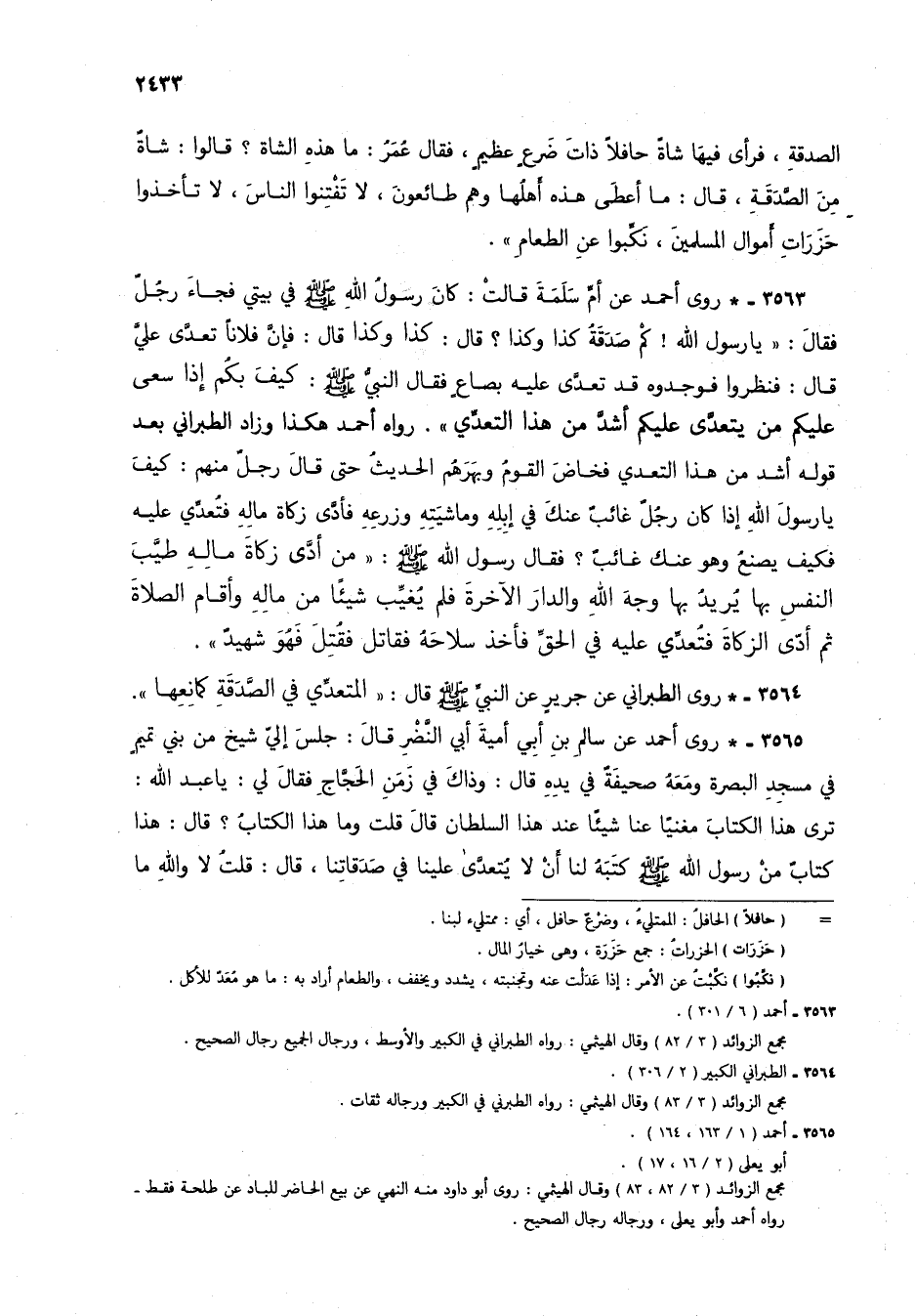 3564 - * روى الطبراني عن جرير عن النبي صلى الله عليه وسلم قال: "المتعدي في الصدقة كمانعها".