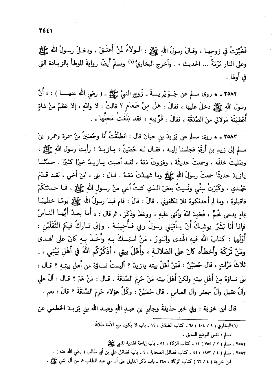 3583 - * روى مسلم عن يزيد بن حيان قال: انطلقت أنا وحصين بن سمرة وعمرو بن مسلم إلى زيد بن أرقم فجلسنا إليه، فقال له حصين: يا زيد! رأيت رسول الله صلى الله عليه وسلم، وصليت خلفه، وسمعت حديثه، وغزوت معه، لقد أصبت يا زيد خيراً كثيراً. حدثنا يا زيد حديثاً سمعت رسول الله صلى الله عليه وسلم وما شهدت معه. قال: بلى، ابن أخي، لقد قدم عهدي، وكبرت سني ونسيت بعض الذي كنت أعي من رسول الله صلى الله عليه وسلم، فما حدثتكم فاقبلوه، وما لم أحدثكموه فلا تكلفوني. قال: قال: قام فينا رسول الله صلى الله عليه وسلم يوماً خطيباً بماء يدعى خم، فحمد الله وأثنى عليه، ووعظ وذكر، ثم قال: "أما بعد أيها الناس فإنما أنا بشر يوشك أن يأتيني رسول ربي فأجيبه. وإني تارك فيكم الثقلين: أولهما: كتاب الله فيه الهدى والنور، من استمسك به وأخذ به كان على الهدى ومن تركه وأخطأه كان على الضلالة، وأهل بيتي، أذكركم الله في أهل بيتي". ثلاث مرات، قال حصين: فمن أهل بيته يا زيد؟ أليست نساؤه من أهل بيته؟ قال: بلى نساؤه من أهل بيته ولكن أهل بيته من حرم الصدقة. قال: من هم؟ قال: آل علي وآل عقيل وآل جعفر وآل العباس. قال حصين: وكل هؤلاء حرم الصدقة؟ قال: نعم.
