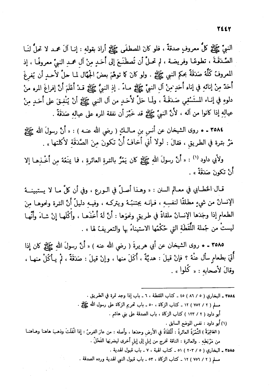 3584 - * روى الشيخان عن أنس بن مالك (رضي الله عنه): "أن رسول الله صلى الله عليه وسلم مر بتمرة في الطريق، فقال: لولا أني أخاف أن تكون من الصدقة لأكلتها".