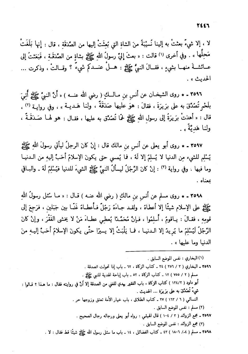 3596 - * روى الشيخان عن أنس بن مالك (رضي الله عنه) "أن النبي صلى الله عليه وسلم أتي بلحم تصدق به على بريرة، فقال: هو عليها صدقة، ولنا هدية"، وفي رواية (2)، قال: "أهدت بريرة إلى رسول الله صلى الله عليه وسلم لحماً تصدق به عليها، فقال: هو لها صدقة، ولنا هدية".
