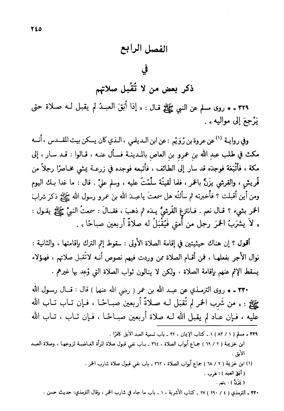 330 - * روى الترمذي عن عبد الله بن عمر (رضي الله عنهما) قال: قال رسول الله صلى الله عليه وسلم: "من شَرِب الخمر لم تُقبَل له صلاةٌ أربعين صباحاً، فإن تاب تاب الله عليه، فإن عاد لم يقبل الله له صلاة أربعين صباحاً، فإن تاب، تاب الله
