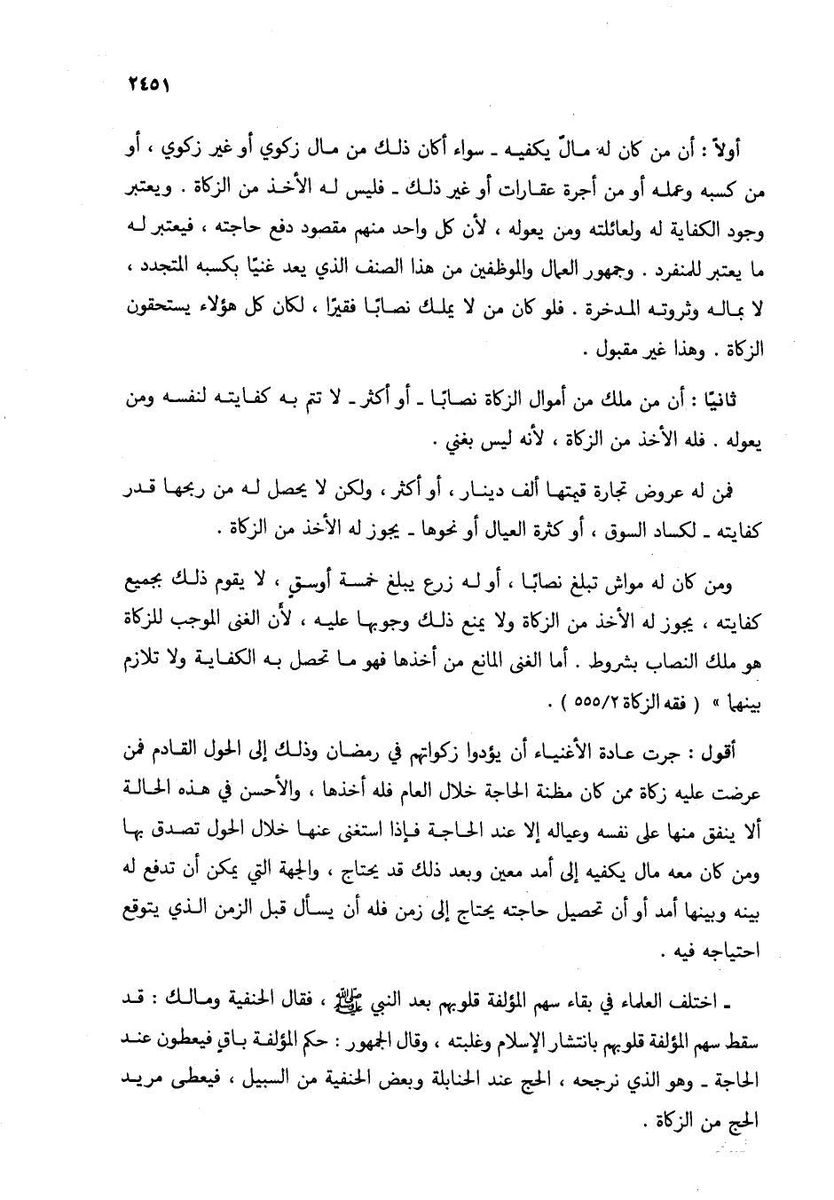 ثانياً: أن من ملك من أموال الزكاة نصاباً- أو أكثر- لا تتم به كفايته لنفسه ومن يعوله. فله الأخذ من الزكاة، لأنه ليس بغني.
