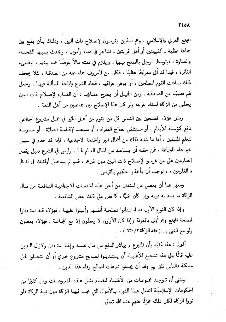 المجتمع العربي والإسلامي، وهم الذين يغرمون لإصلاح ذات البين، وذلك بأن يقع بين جماعة عظيمة- كقبيلتين أو أهل قريتين- تشاجر في دماء وأموال، ويحدث بسببها الشحناء والعداوة، فيتوسط الرجل بالصلح بينهما، ويلتزم في ذمته مالاً عوضاً عما بينهم، ليطفئ الثائرة، فهذا قد أتى معروفاً عظيماً، فكان من المعروف حمله عنه من الصدقة، لئلا يجحف ذلك بسادات القوم المصلحين، أو يوهن عزائمهم، فجاء الشرع بإباحة المسألة فيها، وجعل لهم نصيباً من الصدقة، ومن الجميل أن يصرح علماؤنا: أن الغارم لإصلاح ذات البين يعطى من الزكاة لسداد غريمه ولو كان هذا الإصلاح بين جماعتين من أهل الذمة.