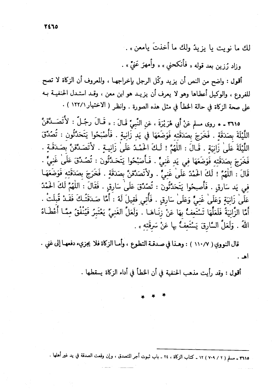 3615 - *روى مسلم عن أبي هريرة، عن النبي قال: "قال رجل: لأتصدقن الليلة بصدقة. فخرج بصدقته فوضعها في يد زانية. فأصبحوا يتحدثون: تصدق الليلة على زانية. قال: اللهم! لك الحمد على زانية. لأتصدق بصدقة. فخرج بصدقته فوضعها في يد غني. فأصبحوا يتحدثون: تصدق على غني. قال: اللهم! لك الحمد على غني. فأصبحوا يتحدثون: تصدق على غني. قال: اللهم! لك الحمد على غني. ولأتصدقن بصدقة. فخرج بصدقته فوضعها في يد سارق. فأصبحوا يتحدثون: تصدق على سارق. فقال: اللهم لك الحمد على زانية وعلى غني وعلى سارق. فأتي فقيل له: أما صدقتك فقد قبلت. أما الزانية فلعلها تستعف بها عن زناها. ولعل الغني يعتبر فينفق مما أعطاه الله. ولعل السارق يستعف بها عن سرقته".