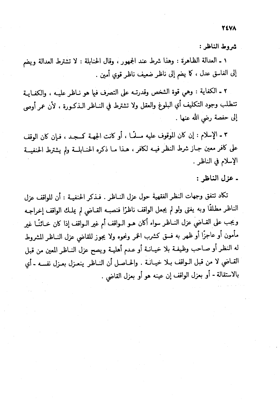 3 - الإسلام: إن كان الموقوف عليه مسلماً، أو كانت الجهة كمسجد، فإن كان الوقف على كافر معين جاز شرط النظر فيه لكافر، هذا ما ذكره الحنابلة ولم يشترط الحنفية الإسلام في الناظر.
