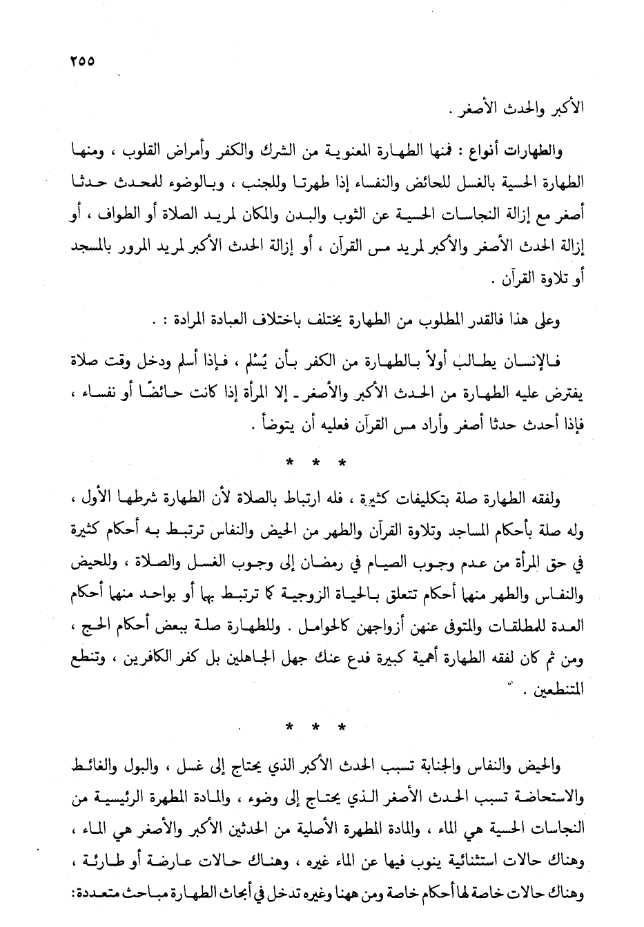 ولفقه الطهارة صلة بتكليفات كثيرة، فله ارتباط بالصلاة لأن الطهارة شرطها الأول، وله صلة بأحكام المساجد وتلاوة القرآن والطهر من الحيض والنفاس ترتبط به أحكام كثيرة في حق المرأة من عدم وجوب الصيام في رمضان إلى وجوب الغسل والصلاة، وللحيض والنفاس والطهر منهما أحكام تتعلق بالحياة الزوجية كما ترتبط بهما أو بواحد منهما أحكام العدة للمطلقات والمتوفى عنهن أزواجهن كالحوامل. وللطهارة صلة ببعض أحكام الحج، ومن ثم كان لفقه الطهارة أهمية كبيرة فدع عنك جهل الجاهلين بل كفر الكافرين، وتنطع المتنطعين.