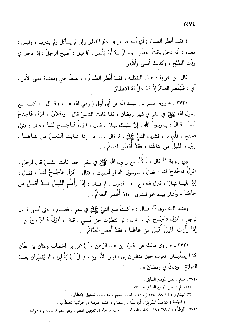 3721 - * روى مالك عن حميد بن عبد الرحمن "أن عمر بن الخطاب وعثمان بن عفان كانا يصليان المغرب حين ينظران إلى الليل الأسود، قبل أن يفطرا، ثم يفطران بعد الصلاة، وذلك في رمضان".