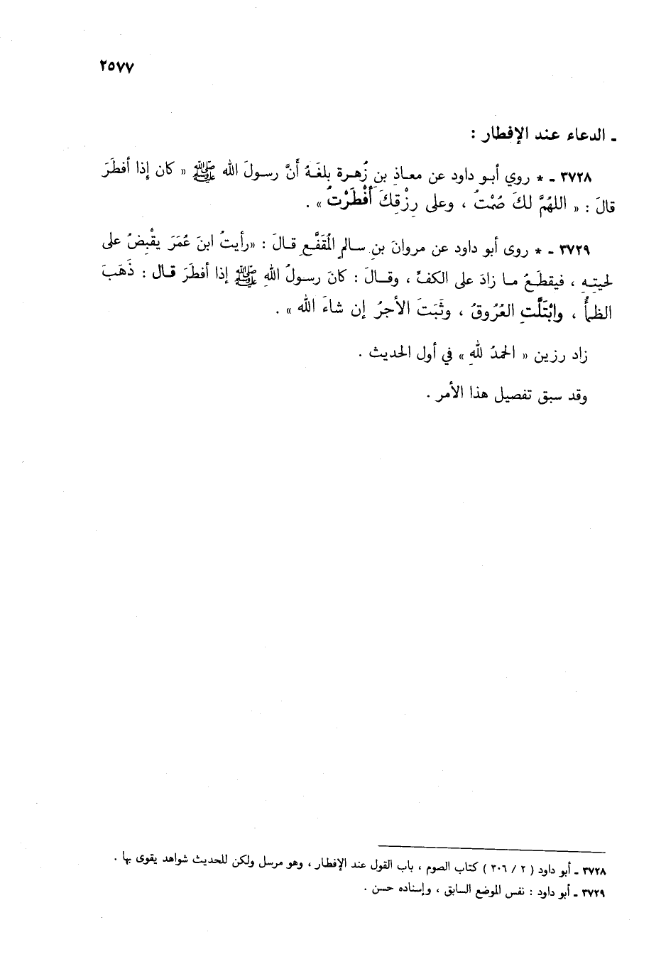 3729 - * روى أبو داود عن مروان بن سالم المقفع قال: "رأيت ابن عمر يقبض على لحيته، فيقطع ما زاد على الكف، وقال: كان رسول الله صلى الله عليه وسلم إذا أفطر قال: ذهب الظمأ، وابتلت العروق، وثبت الأجر إن شاء الله".