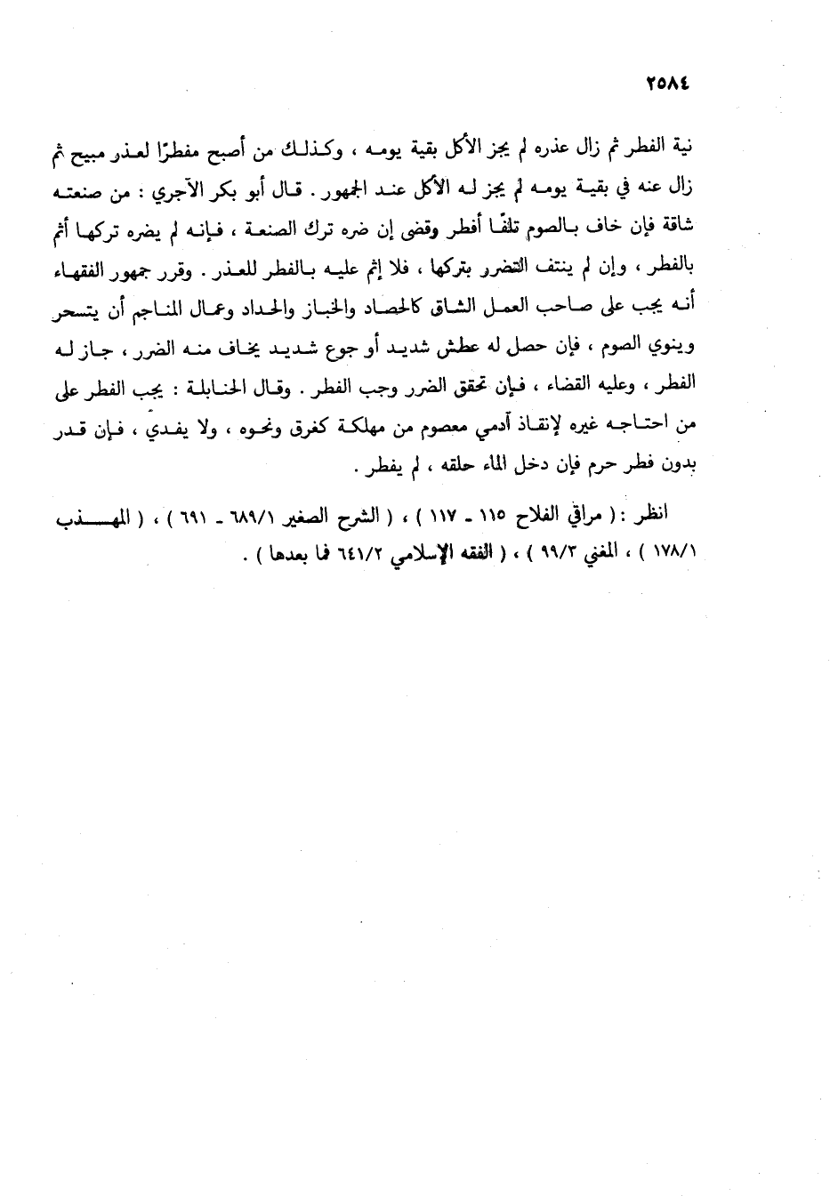 نية الفطر ثم زال عذره لم يجز الأكل بقية يومه، وكذلك من أصبح مفطراً لعذر مبيح ثم زال عنه في بقية يومه لم يجز له الأكل عند الجمهور. قال أبو بكر الآجري: من صنعته شاقة فإن خاف بالصوم تلفاً أفطر وقضى إن ضره ترك الصنعة، فإنه لم يضره تركها أثم بالفطر، وإن لم ينتف التضرر بتركها، فلا إثم عليه بالفطر للعذر. وقرر جمهور الفقهاء أنه يجب على صاحب العمل الشاق كالحصاد والخباز والحداد وعمال المناجم أن يتسحر وينوي الصوم، فإن حصل له عطش شديد أو جوع شديد يخاف منه الضرر، جاز له الفطر، وعليه القضاء، فإن تحقق الضرر وجب الفطر. وقال الحنابلة: يجب الفطر على من احتاجه غيره لإنقاذ آدمي معصوم من مهلكة كغرق ونحوه، ولا يفدي، فإن قدر بدون فطر حرم فإن دخل الماء حلقه، لم يفطر.