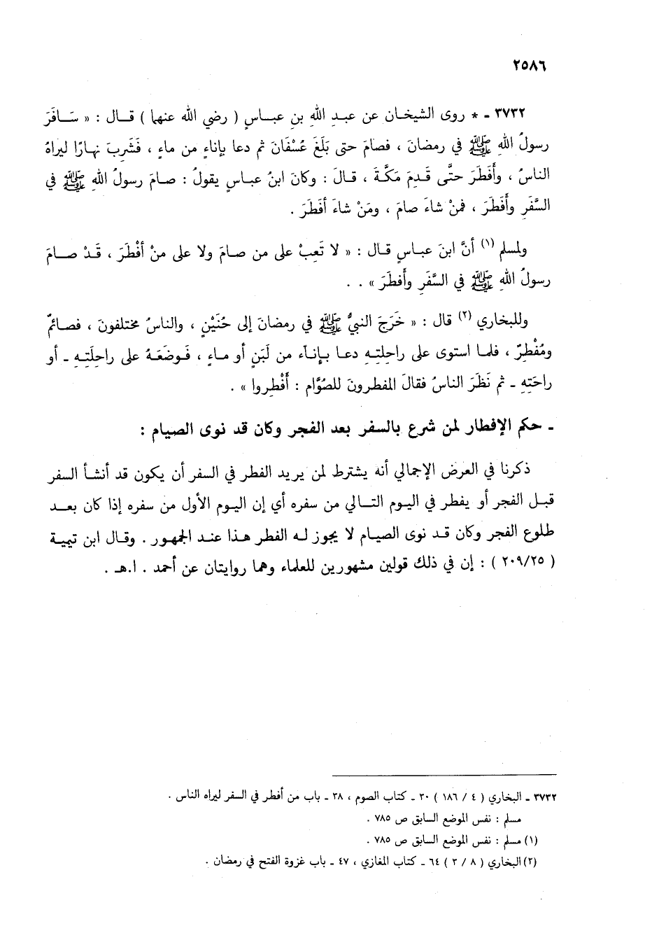 3732 - * روى الشيخان عن عبد الله بن عباس (رضي الله عنهما) قال: "سافر رسول الله صلى الله عليه وسلم في رمضان، فصام حتى بلغ عسفان ثم دعا بإناء من ماء، فشرب نهاراً ليراه الناس، وأفطر حتى قدم مكة، قال: وكان ابن عباس يقول: صام رسول الله صلى الله عليه وسلم في السفر وأفطر، فمن شاء صام، ومن شاء أفطر.