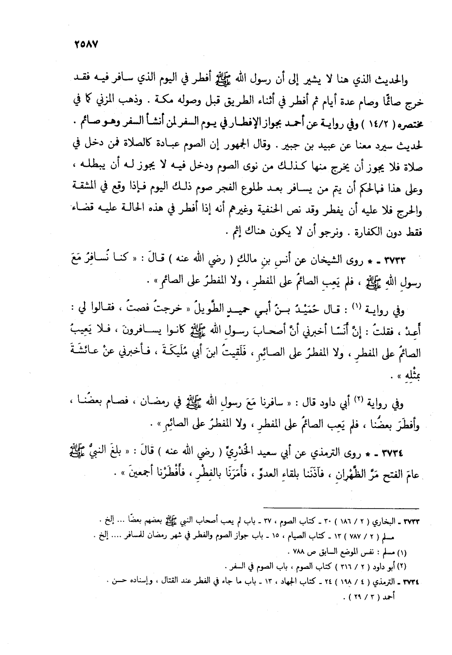 3733 - * روى الشيخان عن أنس بن مالك (رضي الله عنه) قال: "كنا نسافر مع رسول الله صلى الله عليه وسلم، فلم يعب الصائم على المفطر، ولا المفطر على الصائم".
