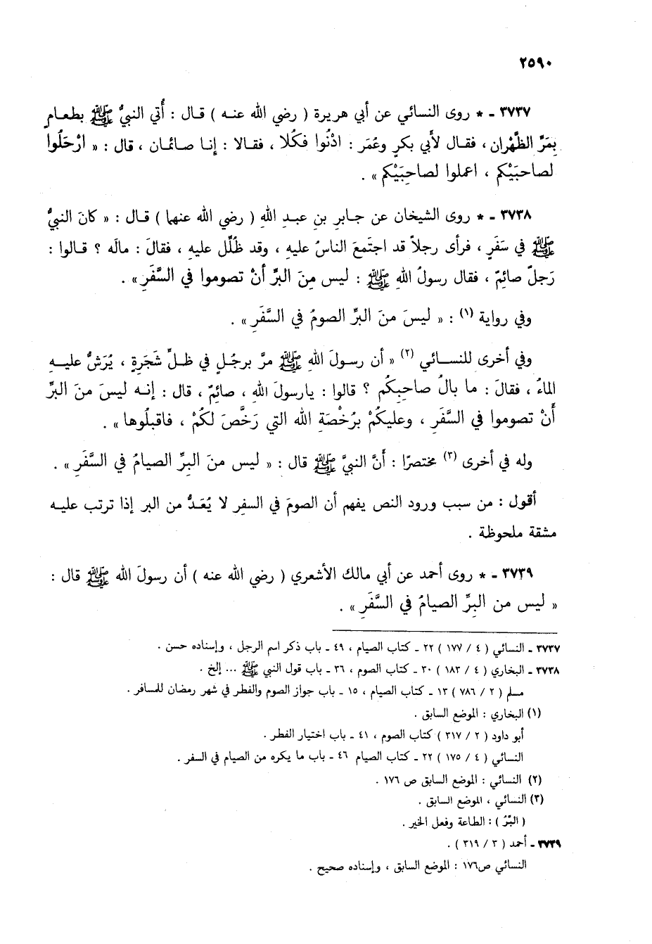 3739 - * روى أحمد عن أبي مالك الأشعري (رضي الله عنه) أن رسول الله صلى الله عليه وسلم قال: "ليس من البر الصيام في السفر".