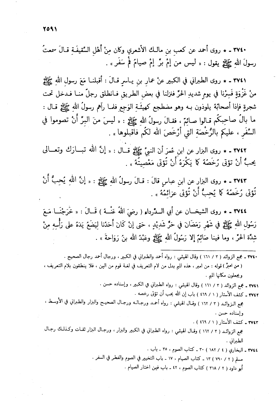 3741 - * روى الطبراني في الكبير عن عمار بن ياسر قال: أقبلنا مع رسول الله صلى الله عليه وسلم من غزوة فسرنا في يوم شديد الحر فنزلنا في بعض الطريق فانطلق رجل منا فدخل تحت شجرة فإذا أصحابه يلوذون به وهو مضطجع كهيئة الوجع فلما رآهم رسول الله صلى الله عليه وسلم قال: ما بال صاحبكم قالوا صائم، فقال رسول الله صلى الله عليه وسلم: "ليس من البر أن تصوموا في السفر، عليكم بالرخصة التي أرخص الله لكم فاقبلوها".