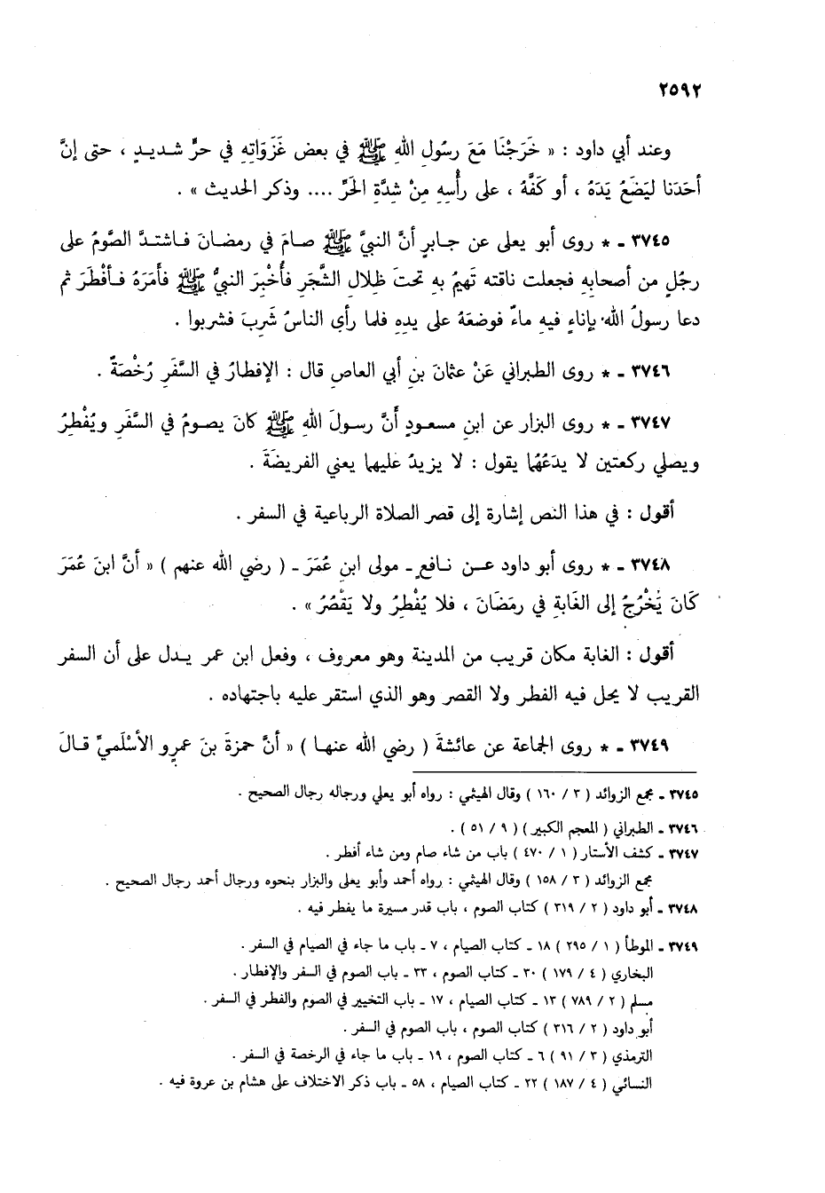 3748 - * روى أبو داود عن نافع- مولى ابن عمر- (رضي الله عنهم) "أن ابن عمر كان يخرج إلى الغابة في رمضان، فلا يفطر ولا يقصر".