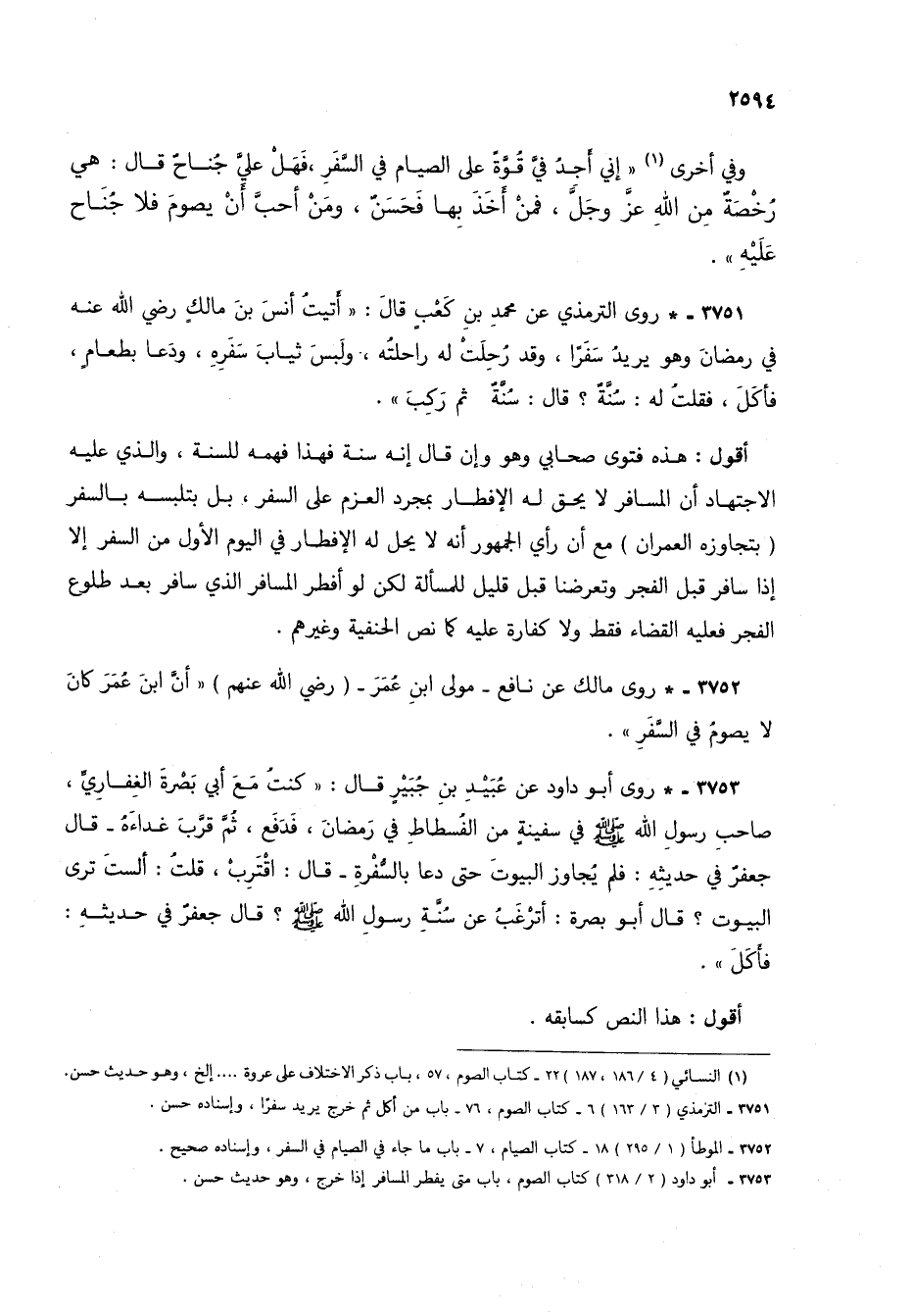 3751 - * روى الترمذي عن محمد بن كعب قال: "أتيت أنس بن مالك رضي الله عنه في رمضان وهو يريد سفراً، وقد رحلت له راحلته، ولبس ثياب سفره، ودعا بطعام، فأكل، فقلت له: سنة؟ قال: سنة ثم ركب".