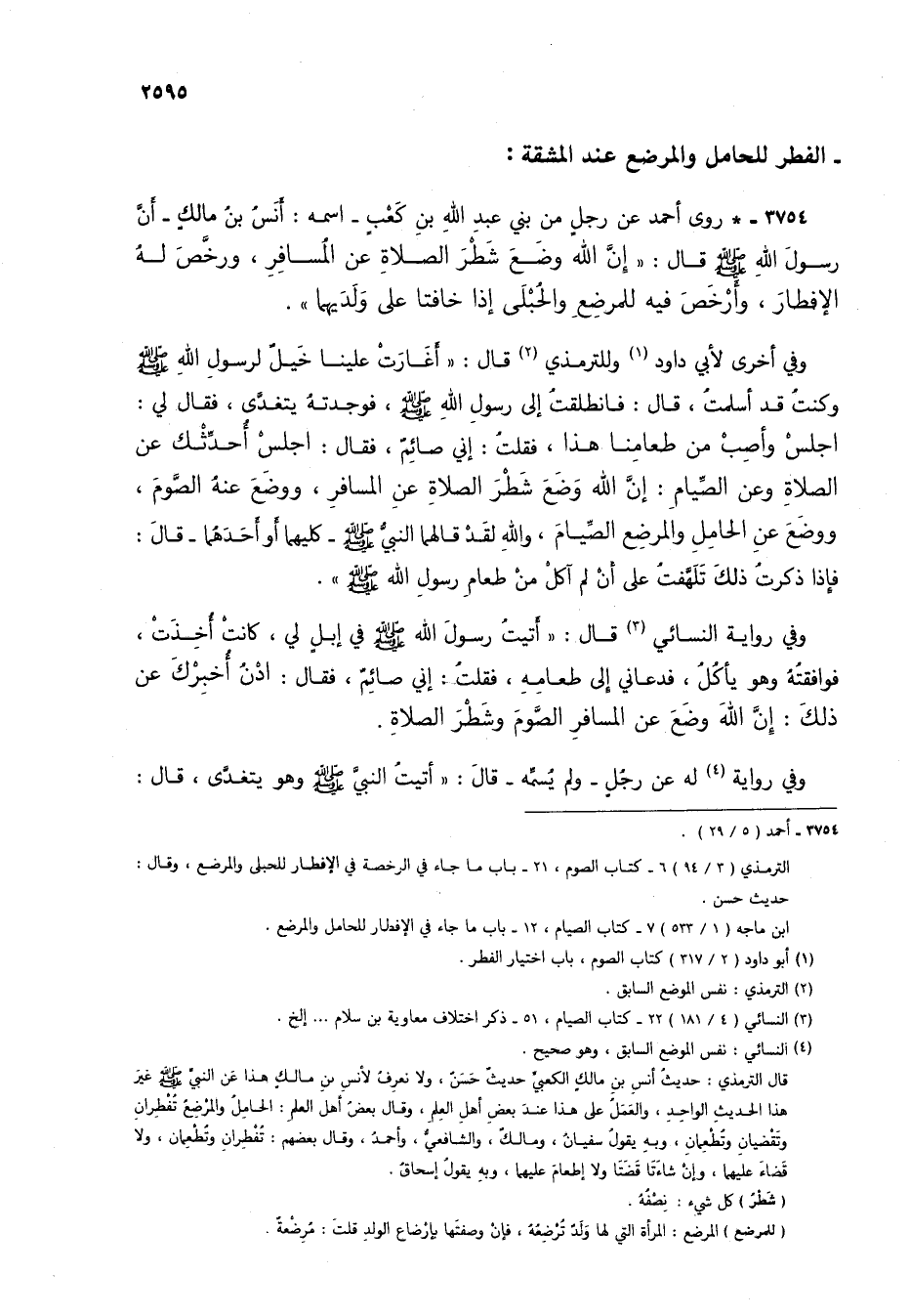 3754 - * روى أحمد عن رجل من بني عبد الله بن كعب- اسمه: أنس بن مالك- أن رسول الله صلى الله عليه وسلم قال: "إن الله وضع شطر الصلاة عن المسافر، ورخص له الإفطار، وأرخص فيه للمرضع والحبلى إذا خافتا على ولديهما".