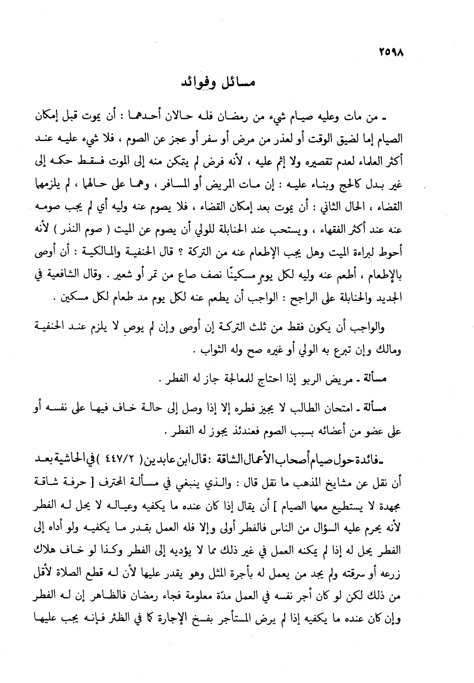 - فائدة حول صيام أصحاب الأعمال الشاقة: قال ابن عابدين (2/ 447) في الحاشية بعد أن نقل عن مشايخ المذهب ما نقل قال: والذي ينبغي في مسألة المحترف [حرفة شاقة مجهدة لا يستطيع معها الصيام] أن يقال إذا كان عنده ما يكفيه وعياله لا يحل له الفطر لأنه يحرم عليه السؤال من الناس فالفطر أولى وإلا فله العمل بقدر ما يكفيه ولو أداه إلى الفطر يحل له إذا لم يمكنه العلم في غير ذلك مما لا يؤديه إلى الفطر وكذا لو خاف هلاك زرعه أو سرقته ولم يجد من يعمل له بأجرة المثل وهو يقدر عليها لأن له قطع الصلاة لأقل من ذلك لكن لو كان أجر نفسه في العمل مدة معلومة فجاء رمضان فالظاهر إن له الفطر وإن كان عنده ما يكفيه إذا لم يرض المستأجر بفسخ الإجارة كما في الظئر فإنه يجب عليها