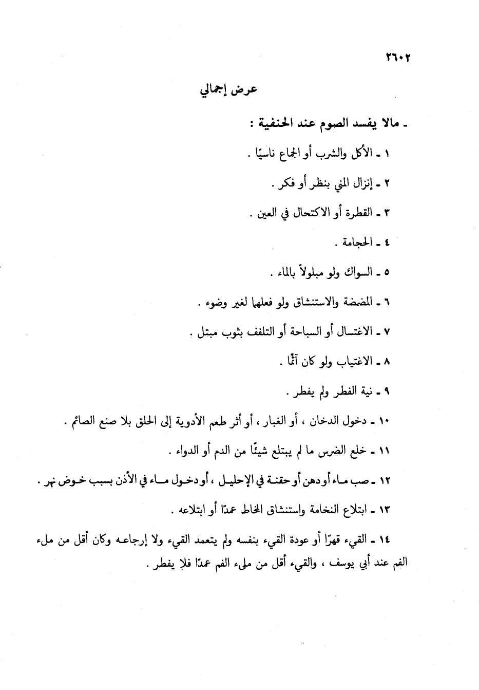 14 - القيء قهراً أو عودة القيء بنفسه ولم يتعمد القيء ولا إرجاعه وكان أقل من ملء الفم عند أبي يوسف، والقيء أقل من ملئ الفم عمداً فلا يفطر.