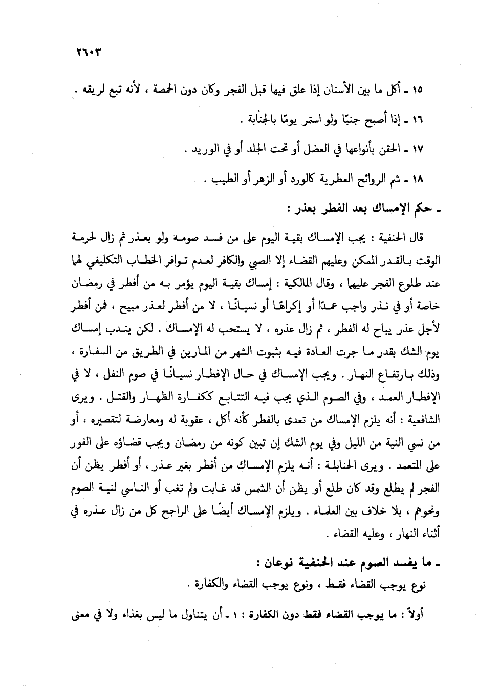 قال الحنفية: يجب الإمساك بقية اليوم على من فسد صومه ولو بعذر ثم زال لحرمة الوقت بالقدر الممكن وعليهم القضاء إلا الصبي والكافر لعدم توافر الخطاب التكليفي لهما عند طلوع الفجر عليهما، وقال المالكية: إمساك بقية اليوم يؤمر به من أفطر في رمضان خاصة أو في نذر واجب عمداً أو إكراهاً أو نسياناً، لا من أفطر لعذر مبيح، فمن أفطر لجل عذر يباح له الفطر، ثم زال عذره، لا يستحب له الإمساك. لكن يندب إمساك يوم الشك بقدر ما جرت العادة فيه بثبوت الشهر من المارين في الطريق من السفارة، وذلك بارتفاع النهار. ويجب الإمساك في حال الإفطار نسياناً في صوم النفل، لا في الإفطار العمد، وفي الصوم الذي يجب فيه التتابع ككفارة الظهار والقتل. ويرى الشافعية: أنه يلزم الإمساك من تعدى بالفطر كأنه أكل، عقوبة له ومعارضة لتقصيره، أو من نسي النية من الليل وفي يوم الشك إن تبين كونه من رمضان ويجب قضاؤه على الفور على المتعمد. ويرى الحنابلة: أنه يلزم الإمساك من أفطر بغير عذر، أو أفطر يظن أن الفجر لم يطلع وقد كان طلع أو يظن أن الشمس قد غابت ولم تغب أو الناسي لنية الصوم ونحوهم، بلا خلاف بين العلماء. ويلزم الإمساك أيضاً على الراجح كل من زال عذره في أثناء النهار، وعليه القضاء.