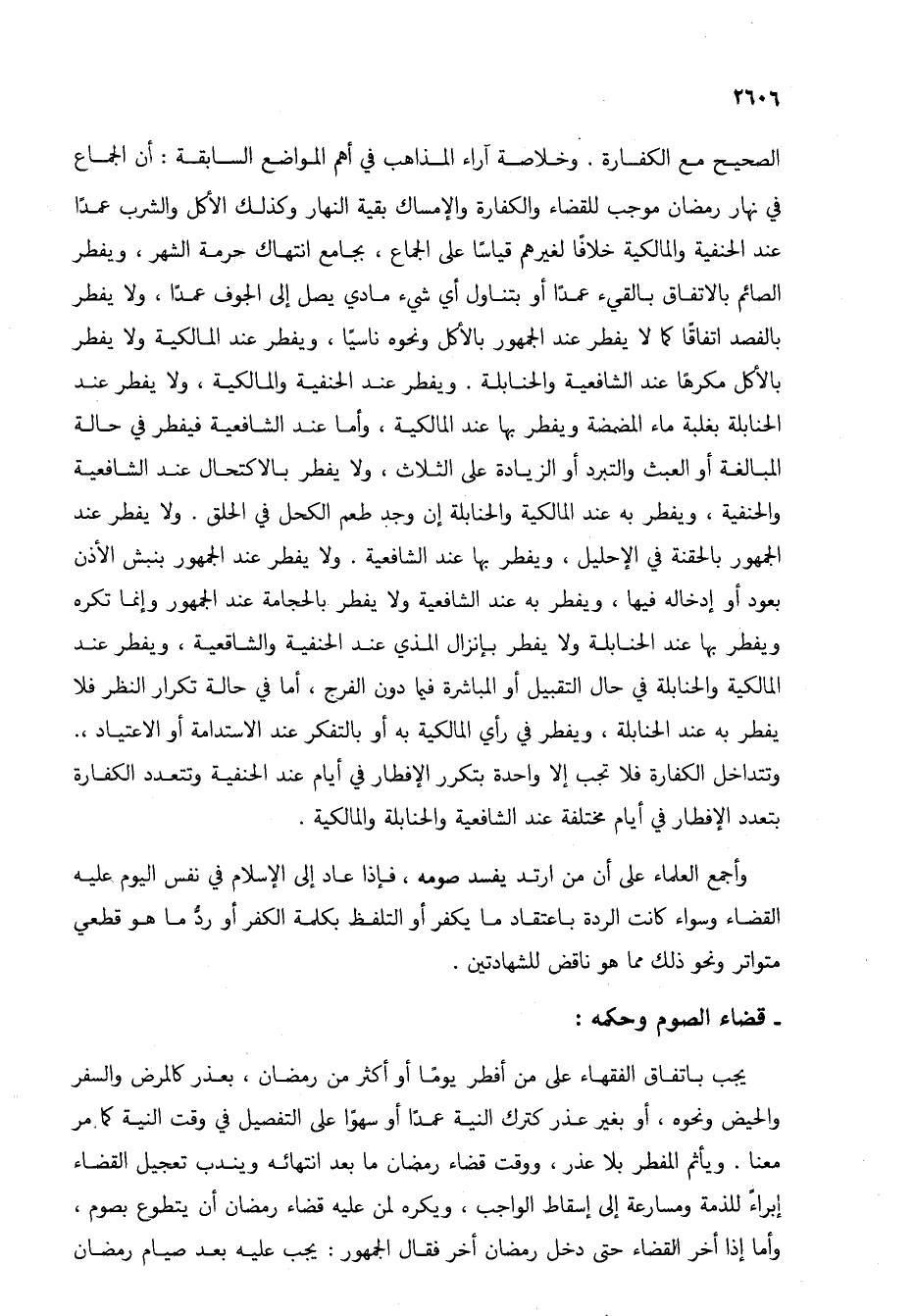 الصحيح مع الكفارة. وخلاصة آراء المذاهب في أهم المواضع السابقة: أن الجماع في نهار رمضان موجب للقضاء والكفارة والإمساك بقية النهار وكذلك الأكل والشرب عمداً عند الحنفية والمالكية خلافاً لغيرهم قياساً على الجماع، بجامع انتهاك حرمة الشهر، ويفطر الصائم بالاتفاق بالقيء عمداً أو بتناول أي شيء مادي يصل إلى الجوف عمداً، ولا يفطر بالفصد اتفاقاً كما لا يفطر عند الجمهور بالأكل ونحوه ناسياً، ويفطر عند المالكية ولا يفطر بالأكل مكرهاً عند الشافعية والحنابلة. ويفطر عند الحنفية والمالكية، ولا يفطر عند الحنابلة بغلبة ماء المضمضة ويفطر بها عند المالكية، وأما عند الشافعية فيفطر في حالة المبالغة أو العبث والتبرد أو الزيادة على الثلاث، ولا يفطر بالاكتحال عند الشافعية والحنفية، ويفطر به عند المالكية والحنابلة إن وجد طعم الكحل في الحلق. ولا يفطر عند الجمهور بالحقنة في الإحليل، ويفطر بها عند الشافعية. ولا يفطر عند الجمهور بنبش الأذن بعود أو إدخاله فيها، ويفطر به عند الشافعية ولا يفطر بالحجامة عند الجمهور وإنما تكره ويفطر بها عند الحنابلة ولا يفطر بإنزال المذي عند الحنفية والشافعية، ويفطر عند المالكية والحنابلة في حال التقبيل أو المباشرة فيما دون الفرج، أما في حالة تكرار النظر فال يفطر به عند الحنابلة، ويفطر في رأي المالكية به أو بالتفكر عند الاستدامة أو الاعتياد، وتتداخل الكفارة فلا تجب إلا واحدة بتكرر الإفطار في أيام عند الحنفية وتتعدد الكفارة بتعدد الإفطار في أيام مختلفة عند الشافعية والحنابلة والمالكية.