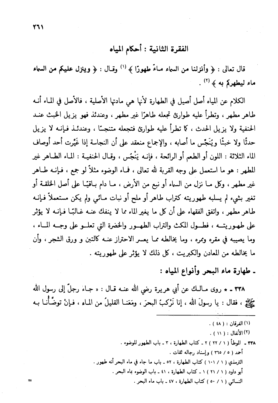 قال تعالى: {وَأَنْزَلْنَا مِنَ السَّمَاءِ مَاءً طَهُورًا} (1) وقال: {وَيُنَزِّلُ عَلَيْكُمْ مِنَ السَّمَاءِ مَاءً لِيُطَهِّرَكُمْ بِهِ} (2).