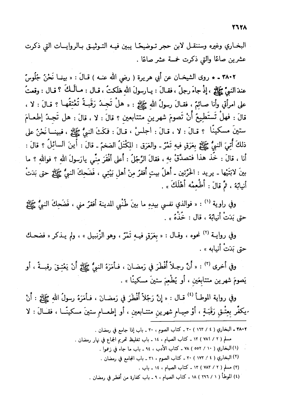 3802 - * روى الشيخان عن أبي هريرة (رضي الله عنه) قال: "بينما نحن جلوس عند النبي صلى الله عليه وسلم، إذ جاء رجل، فقال: يا رسول الله هلكت، قال: مالك؟ قال: وقعت على امرأتي وأنا صائم، فقال رسول الله صلى الله عليه وسلم: "هل تجد رقبة تعتقها؟ قال: لا، قال: فهل تستطيع أن تصوم شهرين متتابعين؟ قال: لا، قال: هل تجد إطعام ستين مسكيناً؟ قال: لا، قال: اجلس، قال: فمكث النبي صلى الله عليه وسلم، فبينا نحن على ذلك أتي النبي صلى الله عليه وسلم بعرق فيه تمر- والعرق: المكتل الضخم- قال: أين السائل؟ قال: أنا، قال: خذ هذا فتصدق به، فقال الرجل: أعلى أفقر مني يا رسول الله؟ فو الله؟ ما بين لابتيها- يريد: الحرتين- أهل بيت أفقر من أهل بيتي، فضحك النبي صلى الله عليه وسلم حتى بدت أنيابه، ثم قال: أطعمه أهلك".