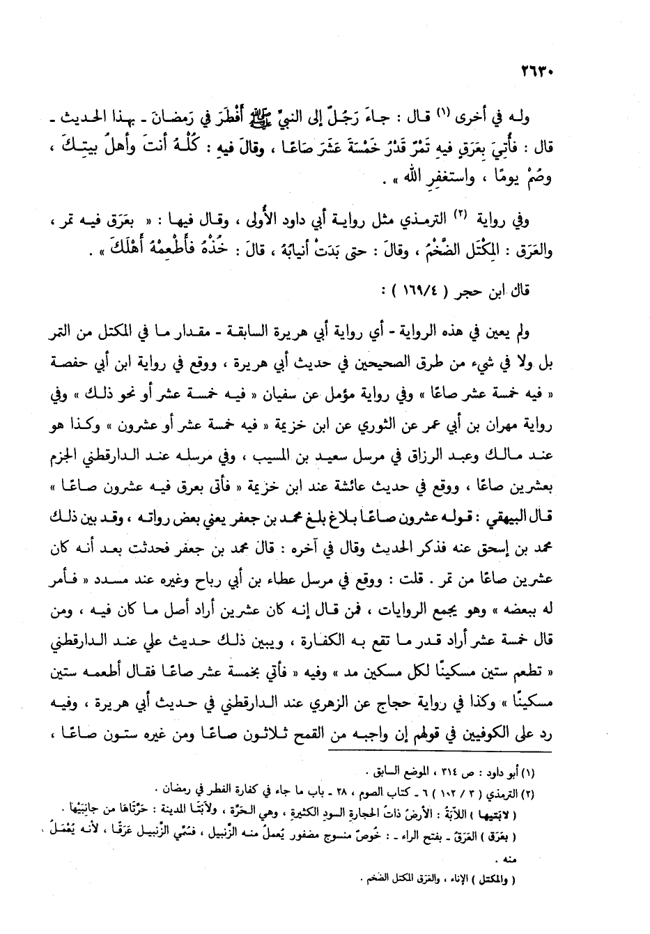 ولم يعين في هذه الرواية- أي رواية أبي هريرة السابقة- مقدار ما في المكتل من التمر بل ولا في شيء من طرق الصحيحين في حديث أبي هريرة، ووقع في رواية ابن أبي حفصة "فيه خمسة عشر صاعاً" وفي رواية مؤمل عن سفيان "فيه خمسة عشر أو نحو ذلك" وفي رواية مهران بن أبي عمر عن الثوري عن ابن خزيمة "فيه خمسة عشر أو عشرون" وكذا هو عند مالك وعبد الرزاق في مرسل سعيد بن المسيب، وفي مرسله عند الدارقطني الجزم بعشرين صاعاً، ووقع في حديث عائشة عند ابن خزيمة "فأتى بعرق فيه عشرون صاعاً" قال البيهقي: قوله عشرون صاعاً بلاغ بلغ محمد بن جعفر يعني بعض رواته، وقد بين ذلك محمد بن إسحق عنه فذكر الحديث وقال في آخره: قال محمد بن جعفر فحدثت بعد أنه كان عشرين صاعاً من تمر. قلت: ووقع في مرسل عطاء بن أبي رباح وغيره عند مسدد "فأمر له ببعضه" وهو يجمع الروايات، فمن قال إنه كان عشرين أراد أصل ما كان فيه، ومن قال خمسة عشر أراد قدر ما تقع به الكفارة، ويبين ذلك حديث علي عند الدارقطني "تطعم ستين مسكيناً لكل مسكين مد" وفيه "فأتي بخمسة عشر صاعاً فقال أطعمه ستين مسكيناً" وكذا في رواية حجاج عن الزهري عند الدارقطني في حديث أبي هريرة، وفيه رد على الكوفيين في قولهم إن واجبه من القمح ثلاثون صاعاً ومن غيره ستون صاعاً،
