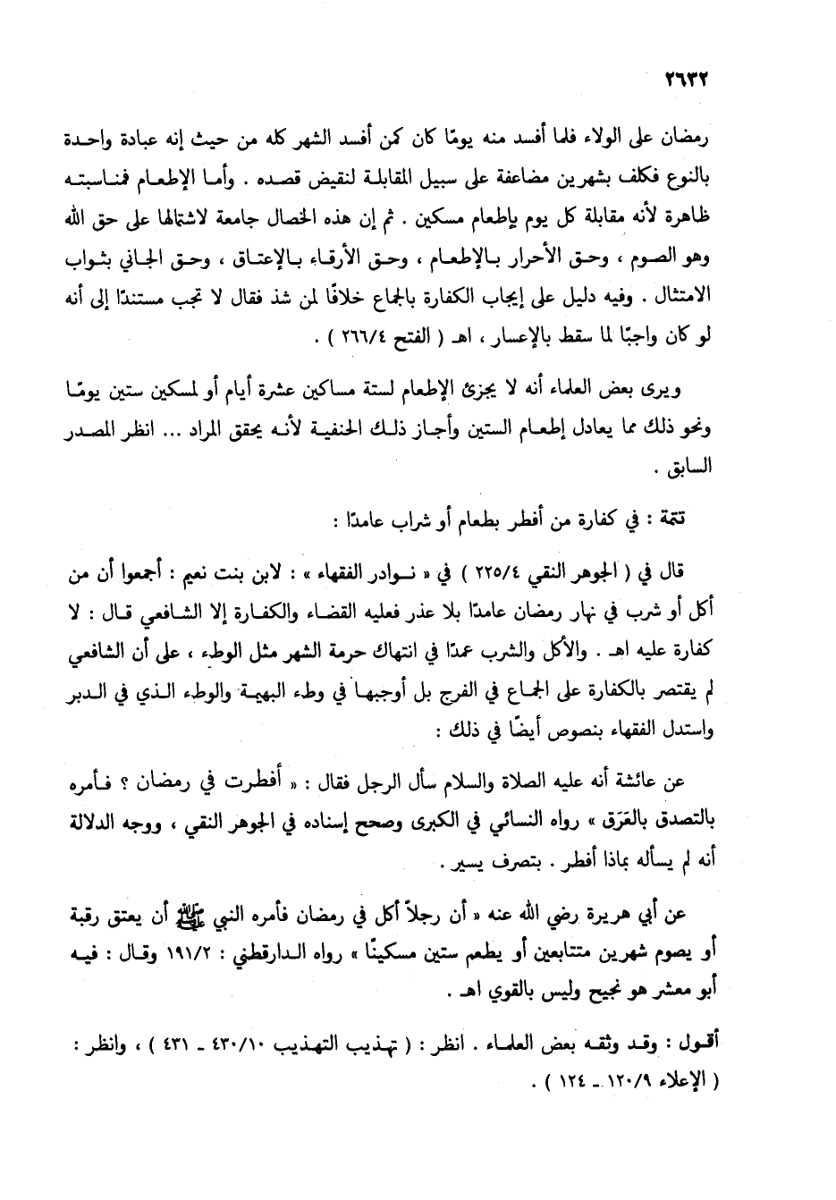 قال في (الجوهر النقي 4/ 225) في "نوادر الفقهاء": لابن بنت نعيم: أجمعوا أن من أكل أو شرب في نهار رمضان عامداً بلا عذر فعليه القضاء والكفارة إلا الشافعي قال: لا كفارة عليه اهـ. والأكل والشرب عمداً في انتهاك حرمة الشهر مثل الوطء، على أن الشافعي لم يقتصر بالكفارة على الجماع في الفرج بل أوجبها في وطء البهيمة والوطء الذي في الدبر واستدل الفقهاء بنصوص أيضاً في ذلك: