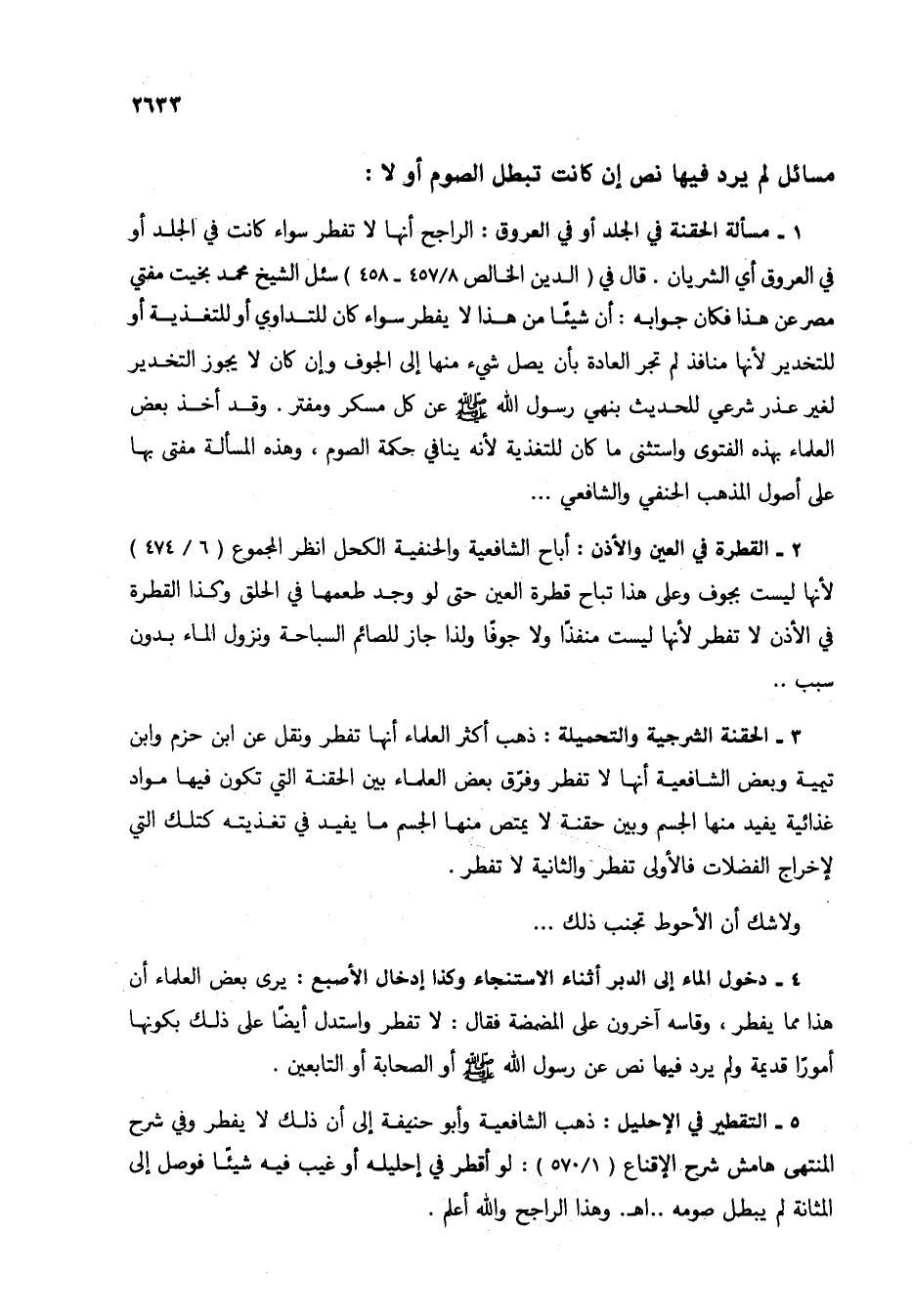 1 - مسألة الحقنة في الجلد أو في العروق: الراجح أنها لا تفطر سواء كانت في الجلد أو في العروق أي الشريان. قال في (الدين الخالص 8/ 457 - 458) سئل الشيخ محمد بخيت مفتي مصر عن هذا فكان جوابه: أن شيئاً من هذا لا يفطر سواء كان للتداوي أو للتغذية أو للتخدير لأنها منافذ لم تجر العادة بأن يصل شيء منها إلى الجوف وإن كان لا يجوز التخدير لغير عذر شرعي للحديث بنهي رسول الله صلى الله عليه وسلم عن كل مسكر ومفتر. وقد أخذ بعض العلماء بهذه الفتوى واستثنى ما كان للتغذية لأنه ينافي حكمة الصوم، وهذه المسألة مفتى بها على أصول المذهب الحنفي والشافعي ...