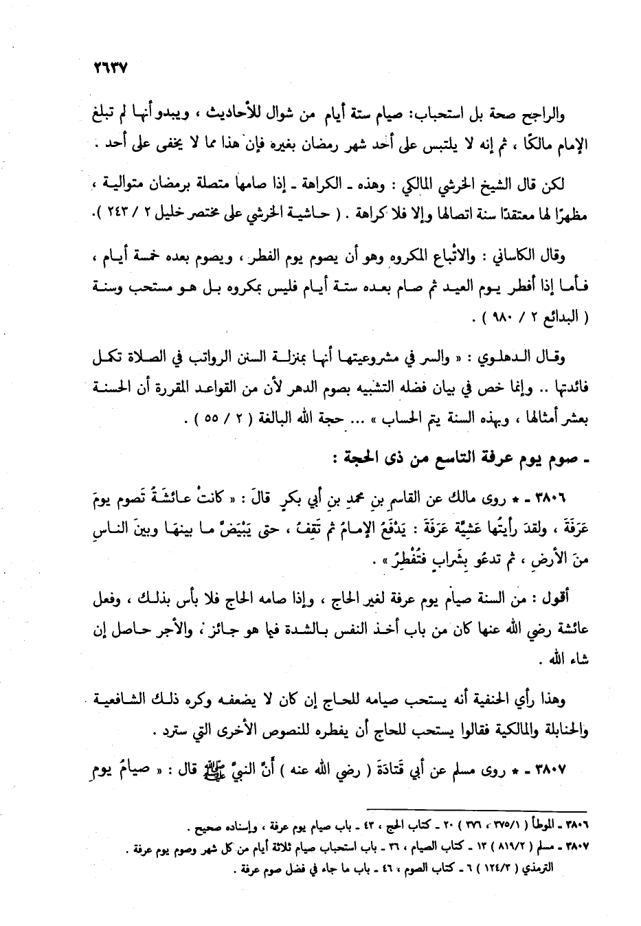 3806 - * روى مالك عن القاسم بن محمد بن أبي بكر قال: "كانت عائشة تصوم يوم عرفة، ولقد رأيتها عشية عرفة: يدفع الإمام ثم تقف، حتى يبيض ما بينها وبين الناس من الأرض، ثم تدعو بشراب فتفطر".